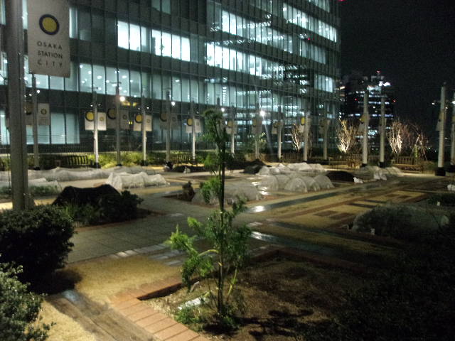 JR大阪駅に直結しているノースゲートビルの11Fにある広場で、ここまではエスカレーターやエレベーターで労苦なく登ることが出来ます。夜間は木々がライトアップされている雰囲気が素敵でしたが、屋外にあるので、私が訪れた冬季の雨模様の日には、ゆっくりと座って休憩することが出来なかったのが残念でした。
