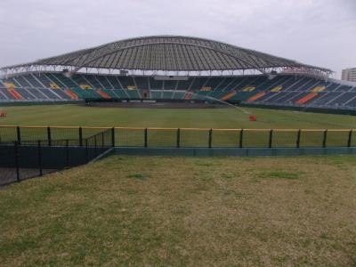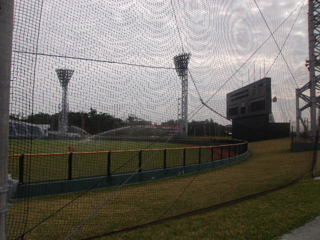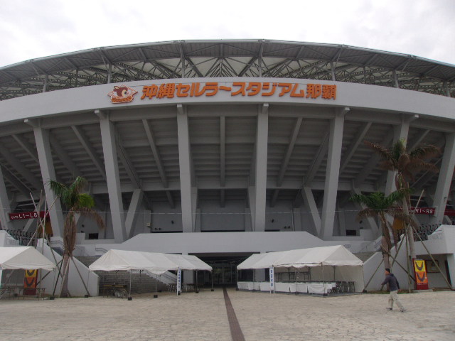最近では、プロ野球の公式戦も時々開催されるようになりや某セリーグ球団の春季キャンプ地としても有名になっている、那覇のみならず沖縄県下を代表する球場がこちらです。内野スタンドはとても立派な多層構造になっている一方で、外野側が昔ながらの天然芝のスタンドで、そのギャップが面白いのですが、それ故に外野側から球場内部の様子が綺麗に見えるのが素敵な球場です。でも、有料興行の際の”タダ観”客対策は大変だろうなあと、要らぬ心配もしてしまいました…。