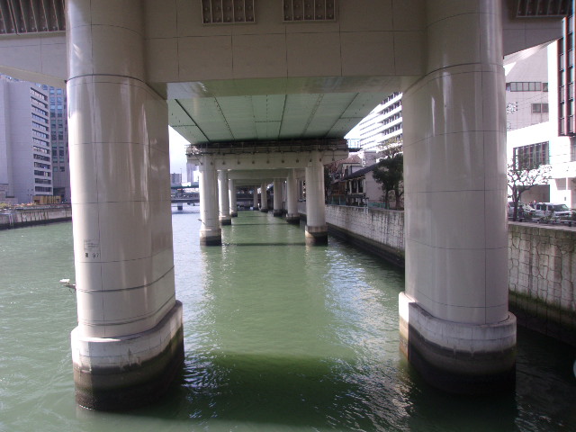 こんな所に珍しさを感じてしまうのも、あまり見慣れていないからなのかもしれないですが、大江橋の北側の高架道路の下部は水中に建っている感じで、なんだかヴェネツィアのような風情が感じられて素敵でした。水運の町としての大阪という側面を現代的に感じられる橋だと個人的には思います。