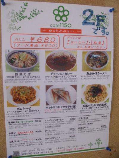 浦添の湯に出かけた際のランチとして、こちらのお店を利用しました。別項でもご紹介しましたが、浦添の湯は温泉施設ですが、ジスタス浦添というスポーツクラブのような建物の中の3Fにあり、中での飲食に関してはカップ麺程度しか用意されていませんので、お食事には2Fにあるこちらがお勧めです。温泉利用者は受付の方に言えば、途中外出と言う形でこちらのお食事利用が可能です。メニューは数種類ありますが、私はチャーハンカレーというのをオーダーしてみました。単品で500円でしたが、プラス180円でコーヒーや紅茶などのドリンクを付けることも可能です。ボリュームがあって味もまずまずかなという印象でした。因みに店名の1150は「い・い・ご・えん」(良いご縁)に由来しているとのことです。