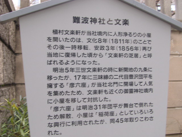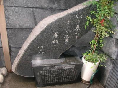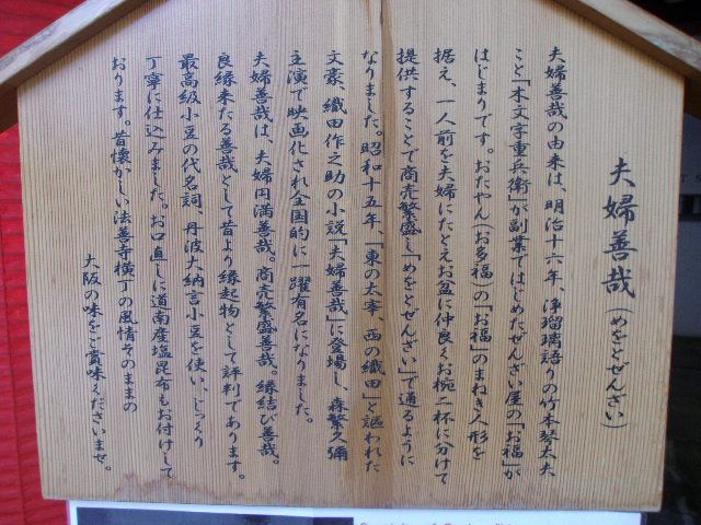 法善寺横丁の一角にある小さな歌碑ですが、お店の前に小さく佇んでいる感じですので、注意して歩かないと見逃してしまう恐れがあります。場所もちょっと判り辛い上、台座部分の解説も読みにくいのが難点です。尚、夫婦善哉の解説に関しては、法善寺の水掛不動の脇にあるお店の解説板の方が懇切丁寧で読みやすかったです。