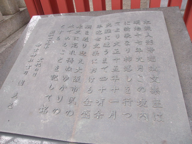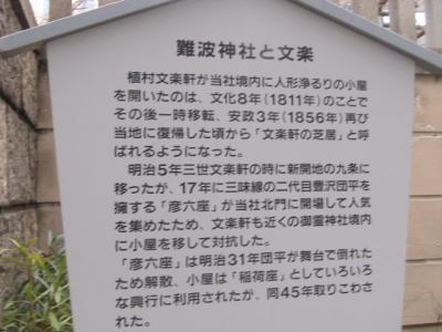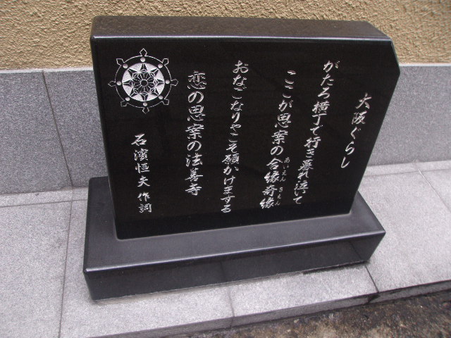 法善寺の傍で小さくて黒い小さな歌碑を見つけて、何だろうなとみて見たらこちらの歌碑でした。歌詞に法善寺が出てくる「大阪ぐらし」という楽曲の歌詞が刻まれていますので、曲を御存じの方ですと感慨も一入かと思いますが、私はよく存じませんでしたので、あまり感動はしませんでした。せめて解説板などが付されていると良いのになと、ちょっと寂しい風情の不遇な歌碑に同情の念が募って来ました。