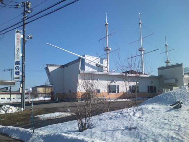 紋別の市街地から渚滑地区へと歩いていた際、巨大な船を目の当たりにして何事かと思ってしまったのがこちらのお店でした。船の形をした回転寿司屋さんとして、地元ではかなり有名になっているようでしたが、私の訪問時は残念ながら営業しておらずに、お店で飲食を楽しめなかったのは残念でした。