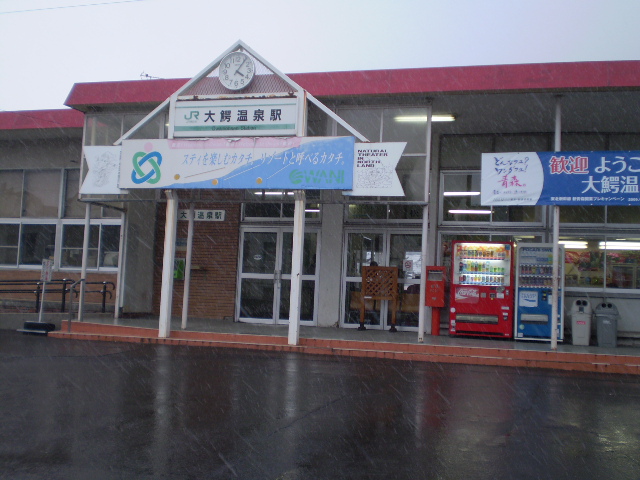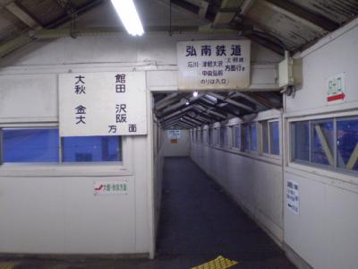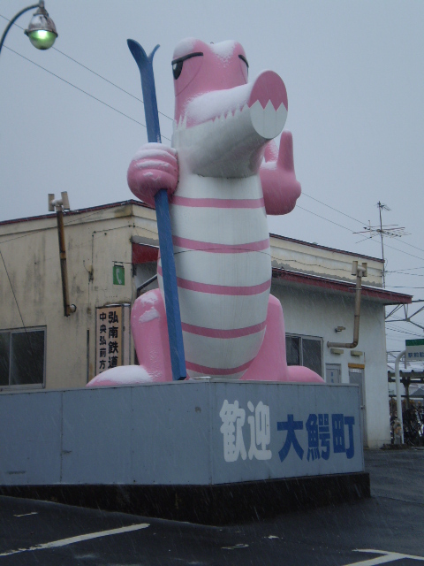 弘南鉄道大鰐線の終点駅です。この路線に関しては、弘前側が弘前駅と中央弘前駅が離れているのに対して、大鰐側はJR大鰐温泉駅と隣接していますので、乗換えの際は、大鰐を利用する方が便利だと思います。弘南鉄道大鰐駅の小さな駅舎前では、その名の通り、駅舎よりも大きな(?)、ユニークなワニさんが出迎えてくれて、なかなか微笑ましい光景でした。大鰐温泉の日帰り入浴施設鰐COMEまでは、徒歩数分でアクセスすることができます。