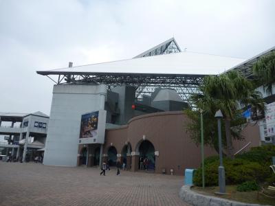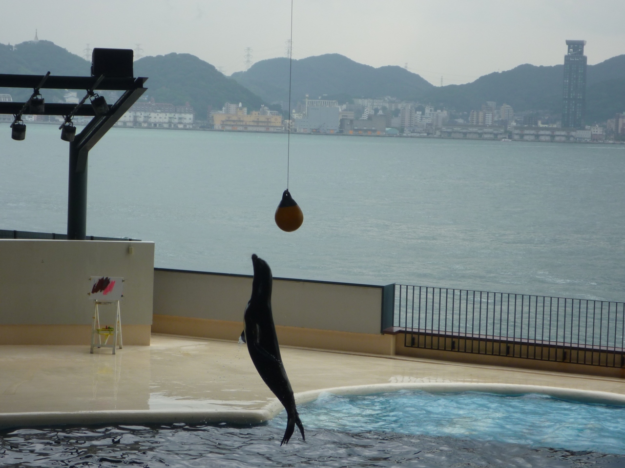ショープールは博多湾に面しており、イルカやアシカがショーをする向こうに眺めることができます。
