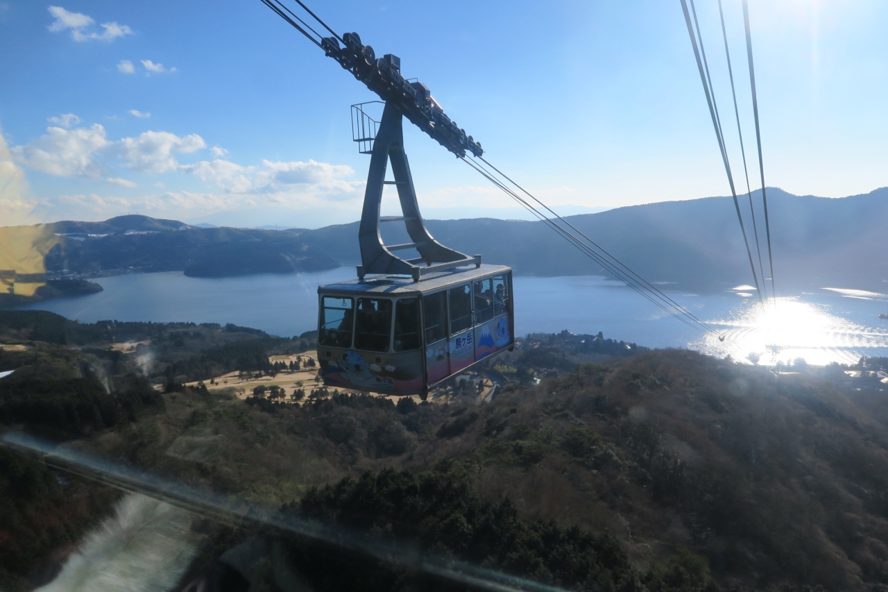 伊豆箱根観光船に乗り箱根園で下船。大きめのロープウェイから富士山と眼下に広がる芦ノ湖を眺めながら頂上へ向かう空路から感動が始まり素晴らしい展望でした。頂上にはしばし歩くと赤い鳥居がある神社があり、遠くに相模湾、裾まで見渡せる富士山、展望台から下をのぞむと芦ノ湖もみえ気持ちがよかったです。風が強かったり濃霧だと運休で行けないとのこと、注意です。