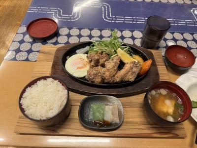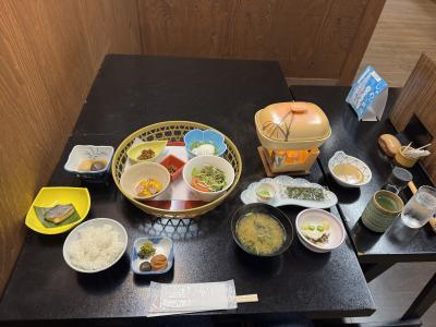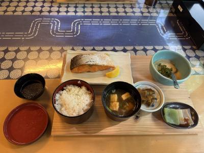夕食は部屋に備え付けのキッチンやレンジで自炊(但し匂いの残るものはNGなので、レトルトなど簡単なものに留めた方が良さそう)してもよし、瀬音の湯のレストランで食べてもよし。今回はレストランで頂きました。ここのレストランは地元食材を使ったハンバーグや焼きそばなどがオススメで、味も美味しいのですよね。尚食事料金の部屋付けができないので要注意。朝食はプランに付いており、今回は選べるメインのうちシャケ定食をチョイス。そしたら巨大なシャケが登場してびっくり。味も美味しくて大満足。