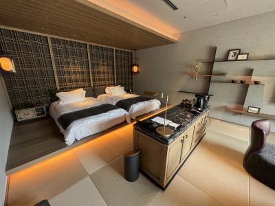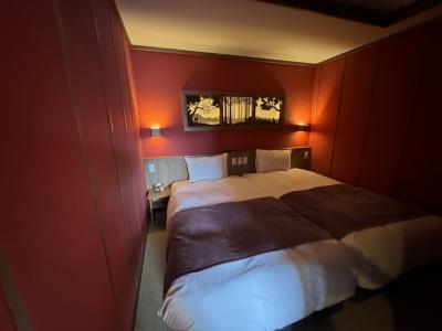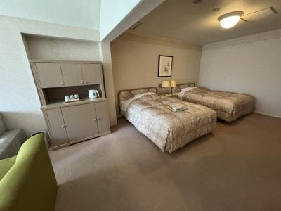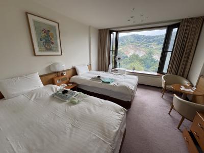 今回宿泊した部屋はハリウッドツインルームで、ドアでリビングと仕切れるベッドルーム、ソファーのあるリビングスペース、そして草津の街を見下ろす専用の温泉露天風呂があり優雅に寛げます。ただ部屋の露天風呂はボタンを押して湯張りを行うタイプのため、お湯が冷めた後の翌朝などに再度暖めるのが結構面倒でした。