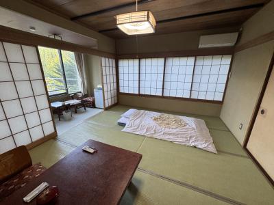 部屋は若干年季がありますが広い和室。無駄な設備がなくてなんだか落ち着きます。ウォシュレット付きトイレも部屋にあるし、清潔感も問題なし。布団が予め敷いてあるので到着後すぐに寝転べるのも◎です。