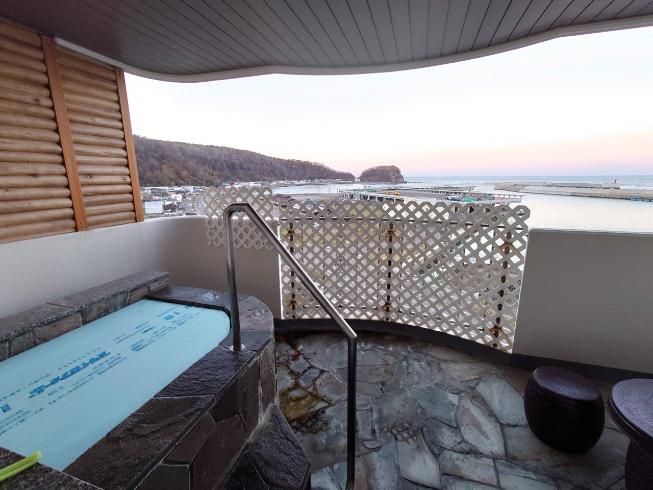 知床の観光拠点である道の駅ウトロの近くにあり、知床の寝床としてとても便利。今回は6階の特別室に泊まってみましたが、和洋室の部屋には知床の海を望むテラス&温泉露天風呂、洗濯機そして電子レンジなど、広さに留まらず快適設備が充実。