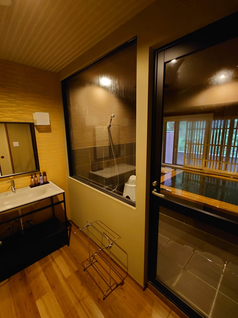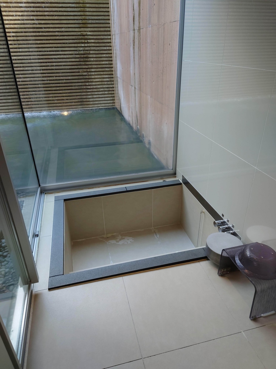 部屋のバスタブはお洒落で良いが、排水が直結してない構造上、風呂水を排水する際水浸しになるのに要注意。