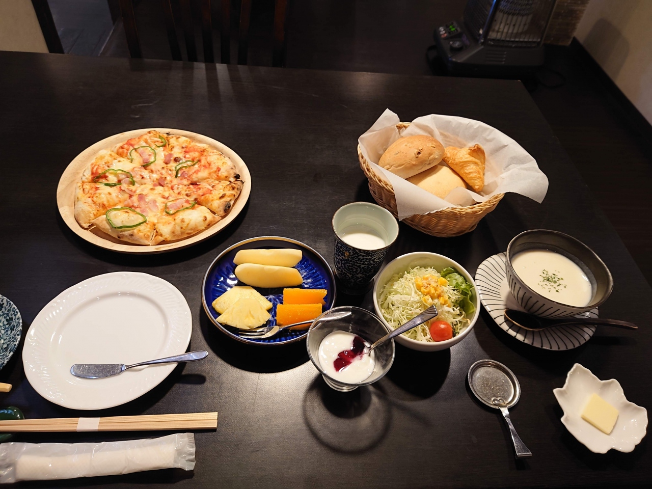 そして朝食は1人かつ山奥なのに石窯焼きピザが1枚まるまる登場して、比較的沢山食べる私ですらもうノックダウン。