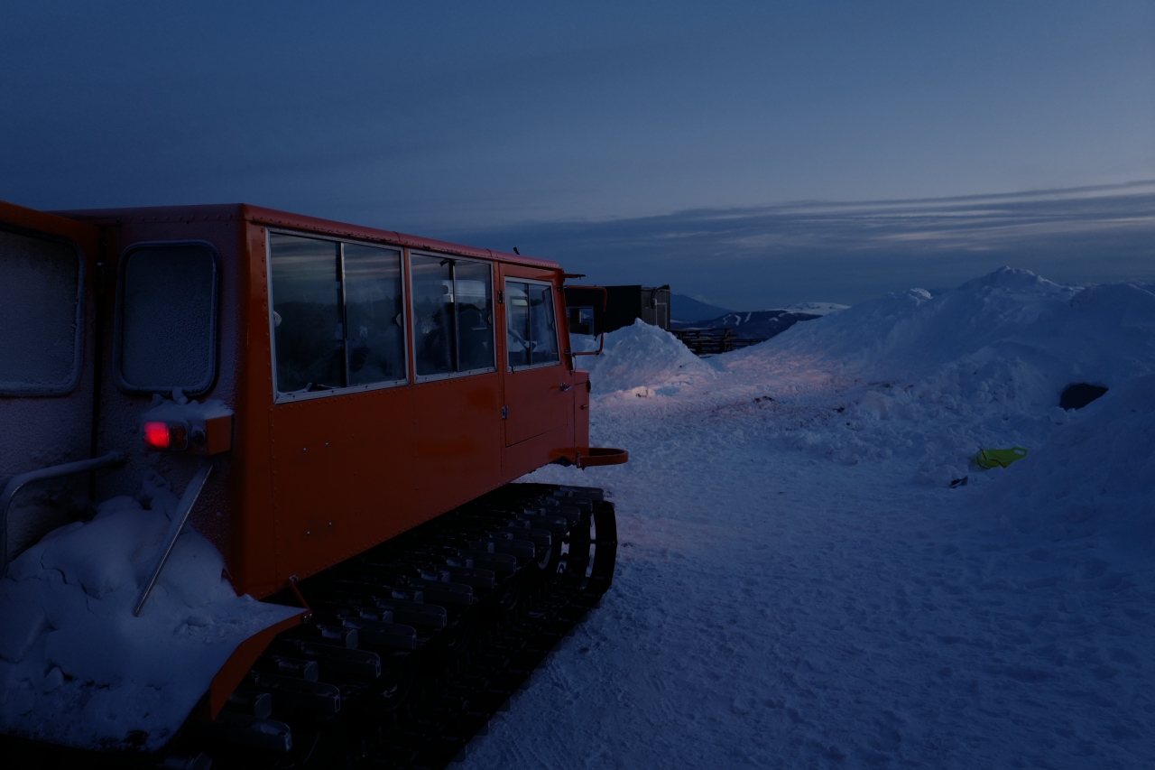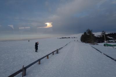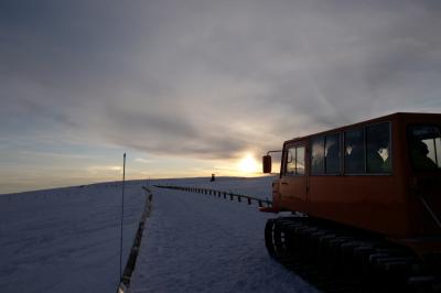 ふる里館から雪上車に揺られて観光。大雪原に沈む、美しすぎる夕陽を見られて最高でした!