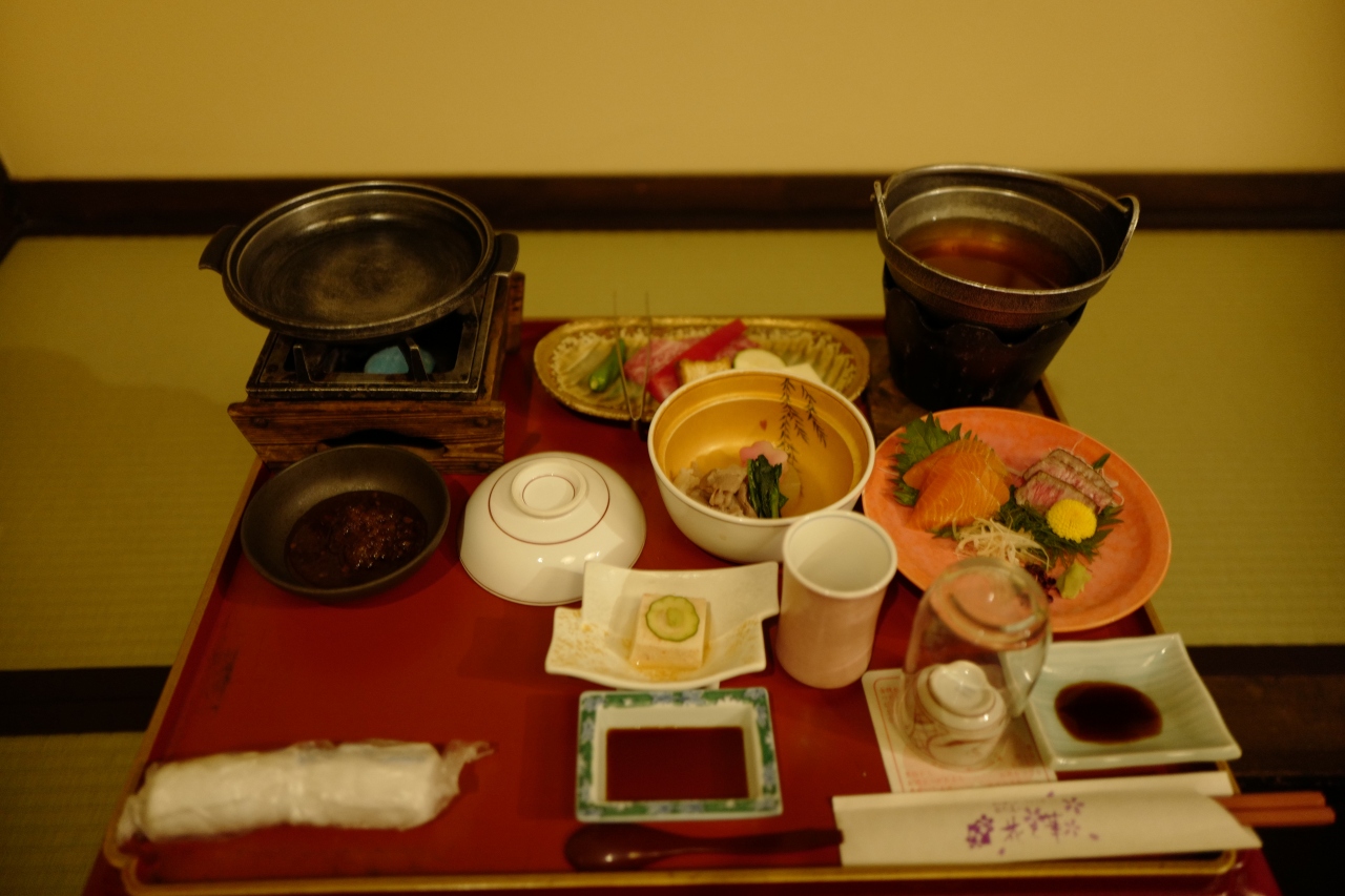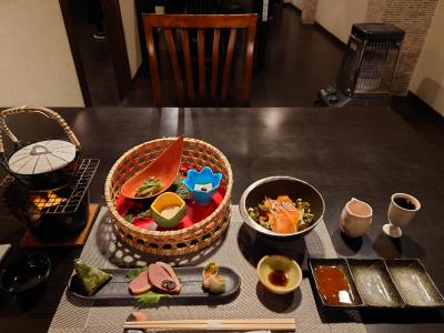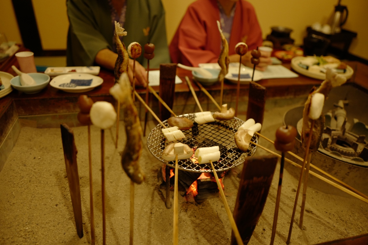 夕食は今回、個室食で頂ける2番館に通されました。囲炉裏で炙る名物のお狩場焼きは勿論、その他の料理も品数満点で、全て食べきることができませんでした。