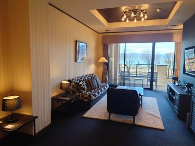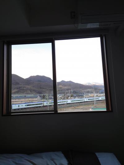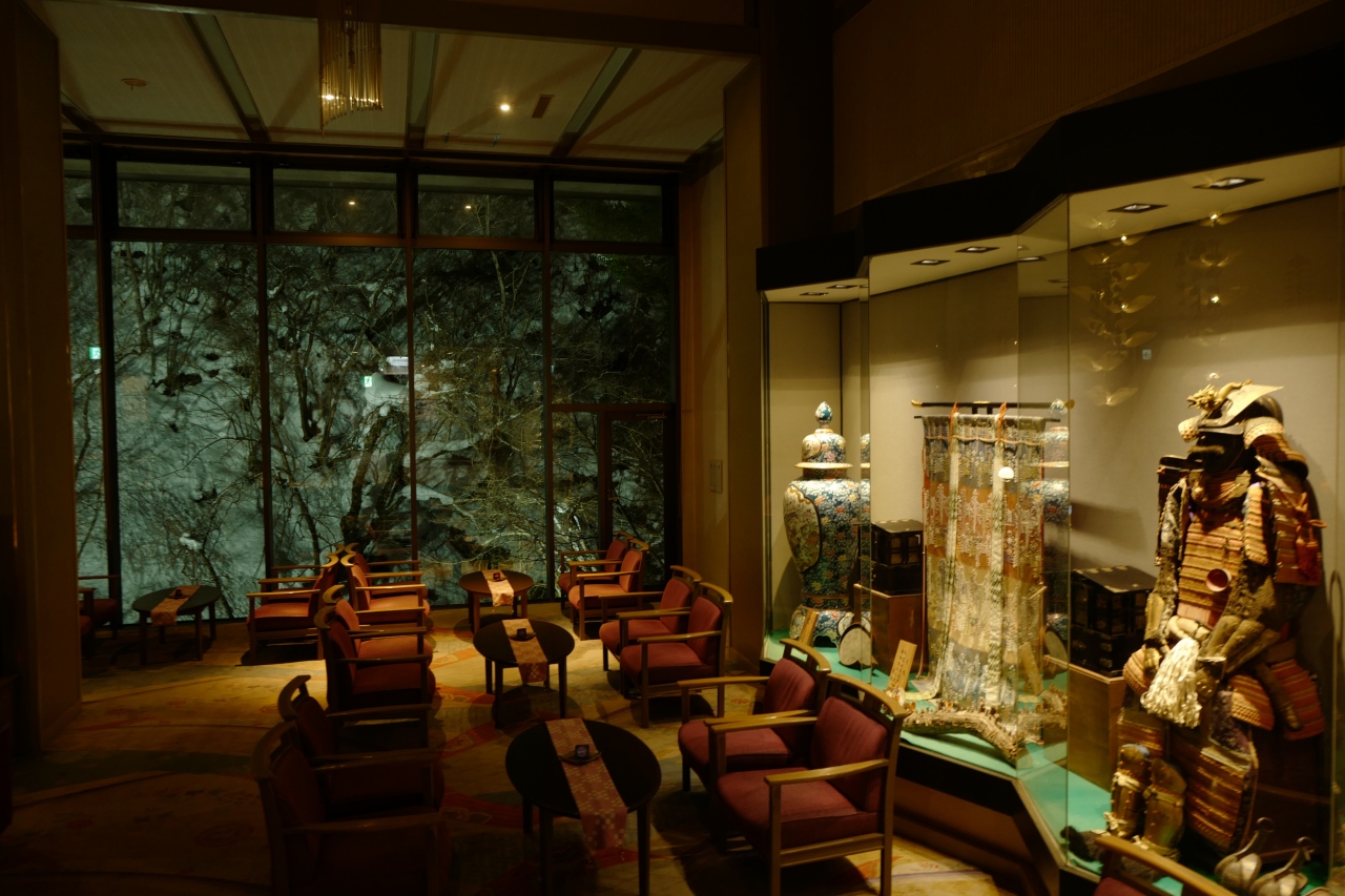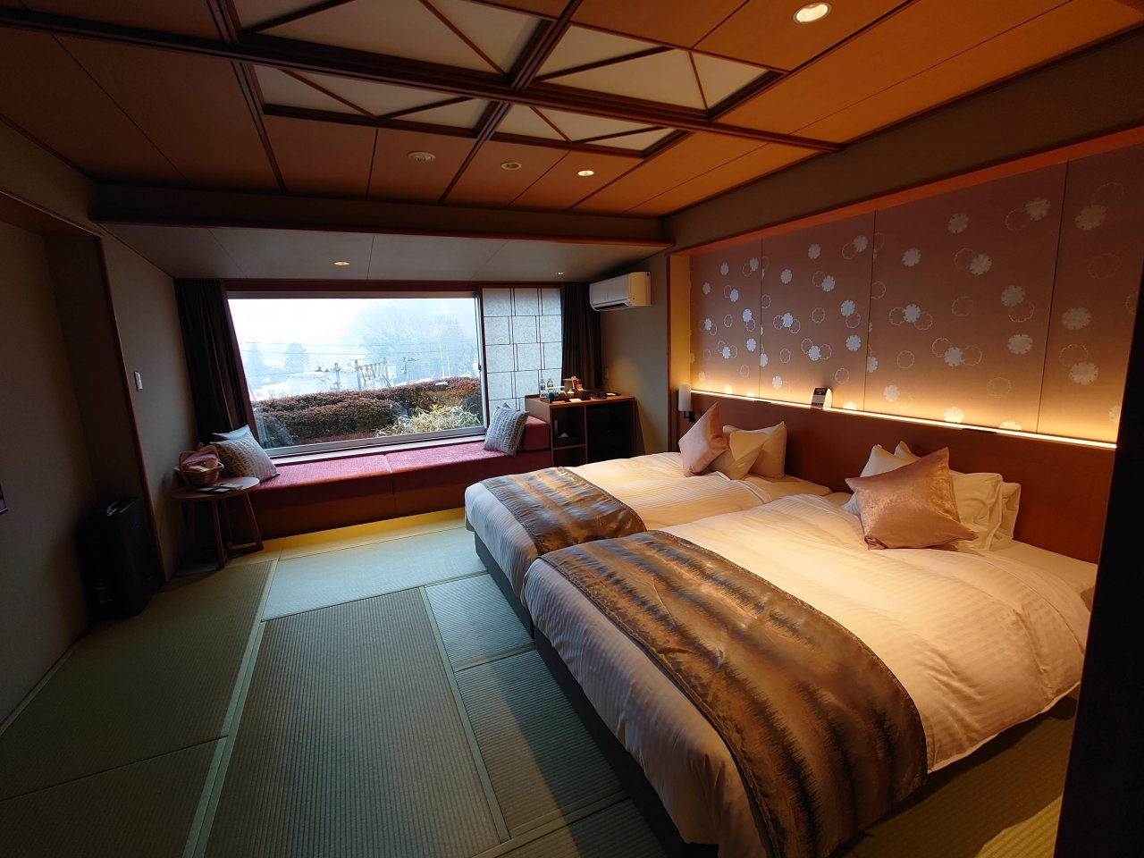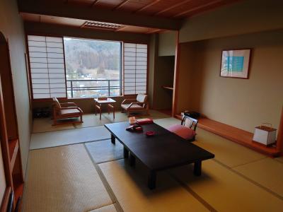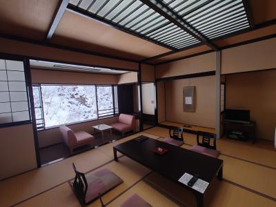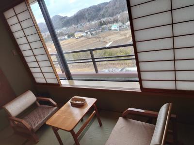 宿の中はロビーなどが洒落た雰囲気で眺望も良く、実に良い感じ。部屋の名前には「百人一首」の冒頭がつけられていて、今回は春の花見館7階の和室「あけぬれば」に通されました。4人で泊まっても十分な広さがあり、雪景色も良く見える綺麗な和室でとっても快適に過ごせました。