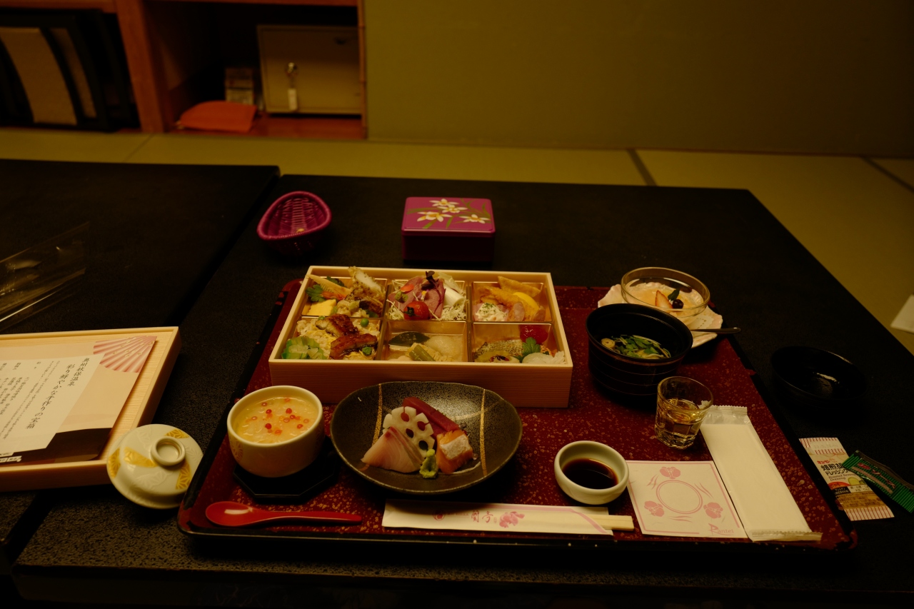 食事は夕食が部屋食弁当、朝食がバイキングとなるプランをチョイス。夕食の弁当は決して量が多かったり、豪華なわけではありませんが、過度に少ないということもなく。旅館らしい食事を適度に楽しめるので、年配の方など「あまり量はいらないよ」という向きには良いと思います。
