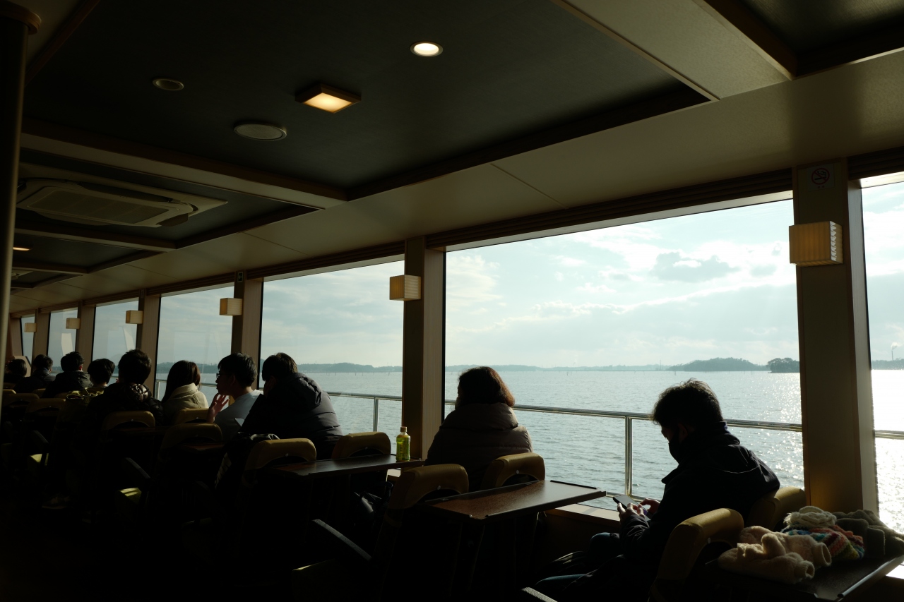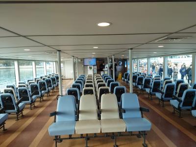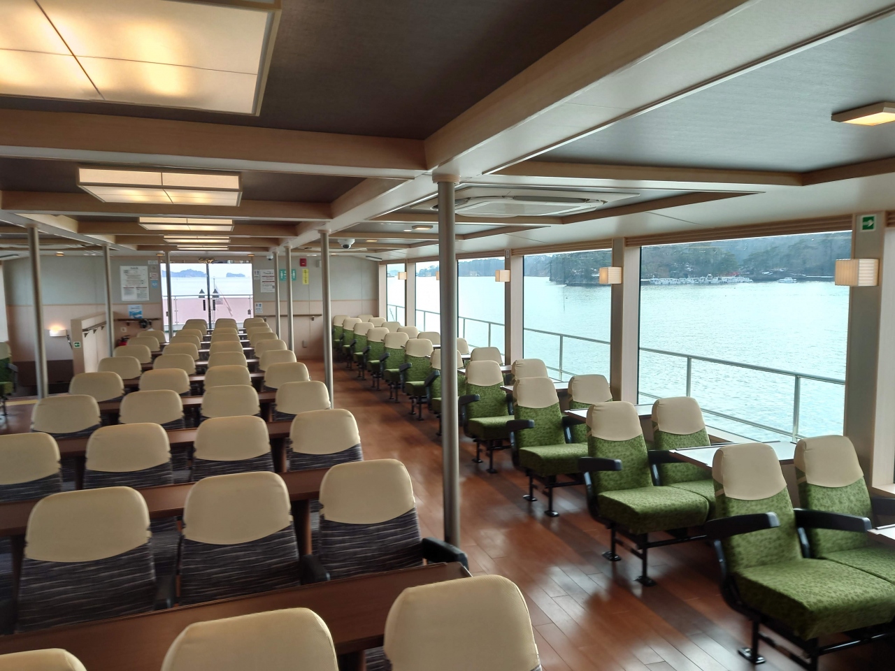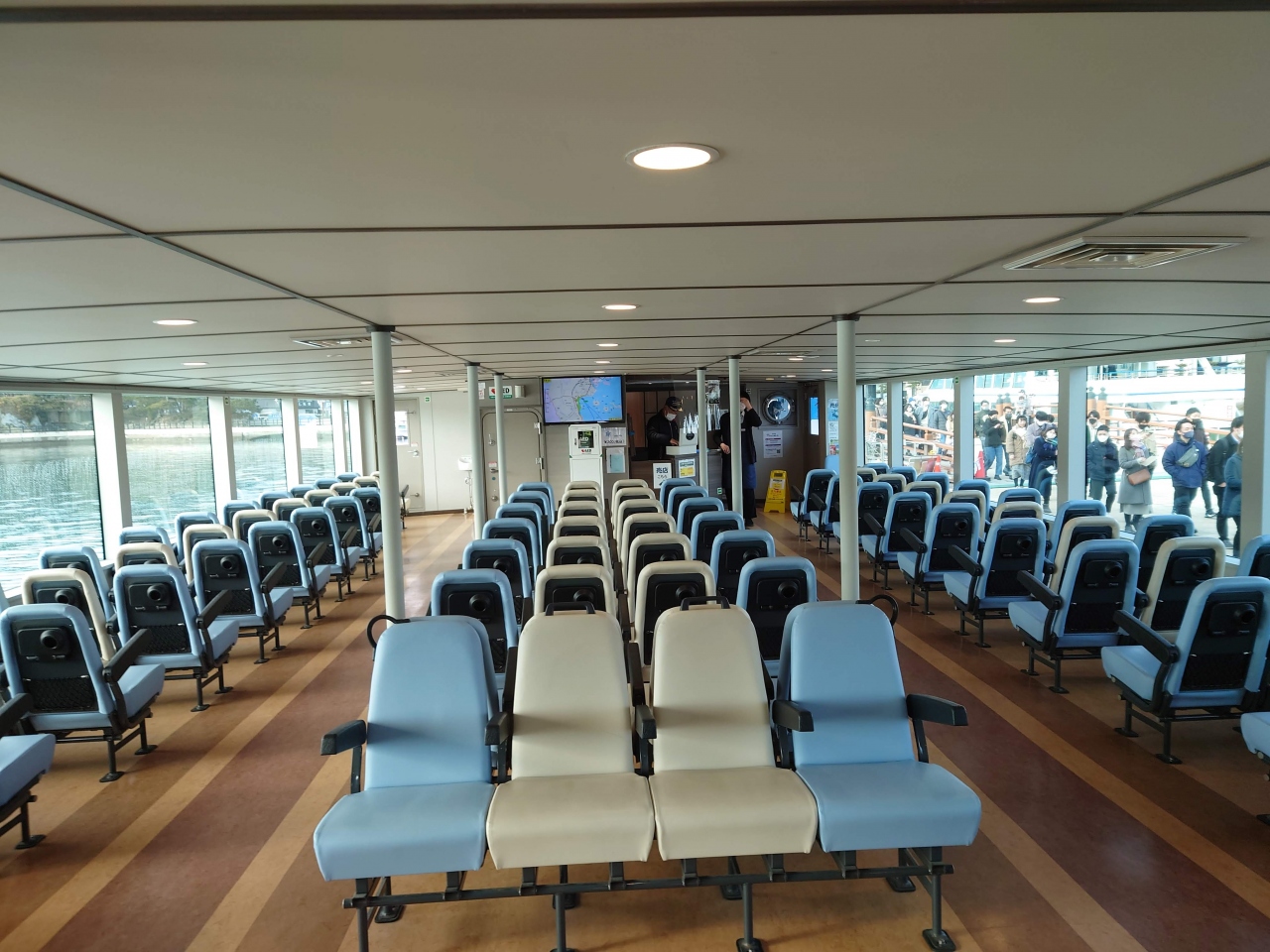 船は2階建ての構造で、1階が自由席・2階は追加料金が600円かかるグリーン席になっています。今回は折角なので追加料金を払って後者を利用。1階よりもゆったりした座席と、より高い視点からの眺めを楽しめるので、その価値はあると思います。