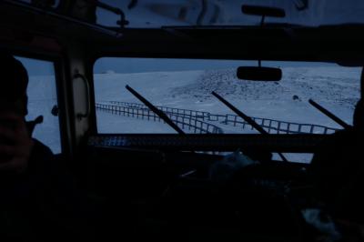 道中の牧場周囲で一旦下車し、まずは大雪原に沈む夕陽を見物。ものすごく寒いので雪もなかなか固まらないようで、ズボズボハマってなかなか大変でしたが、どこまでも白い景色に圧倒です。