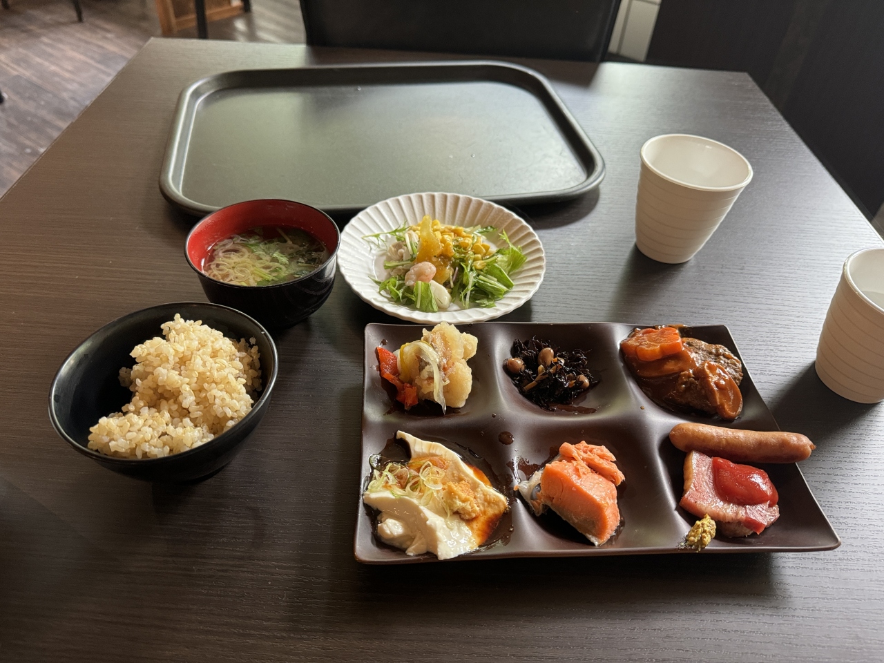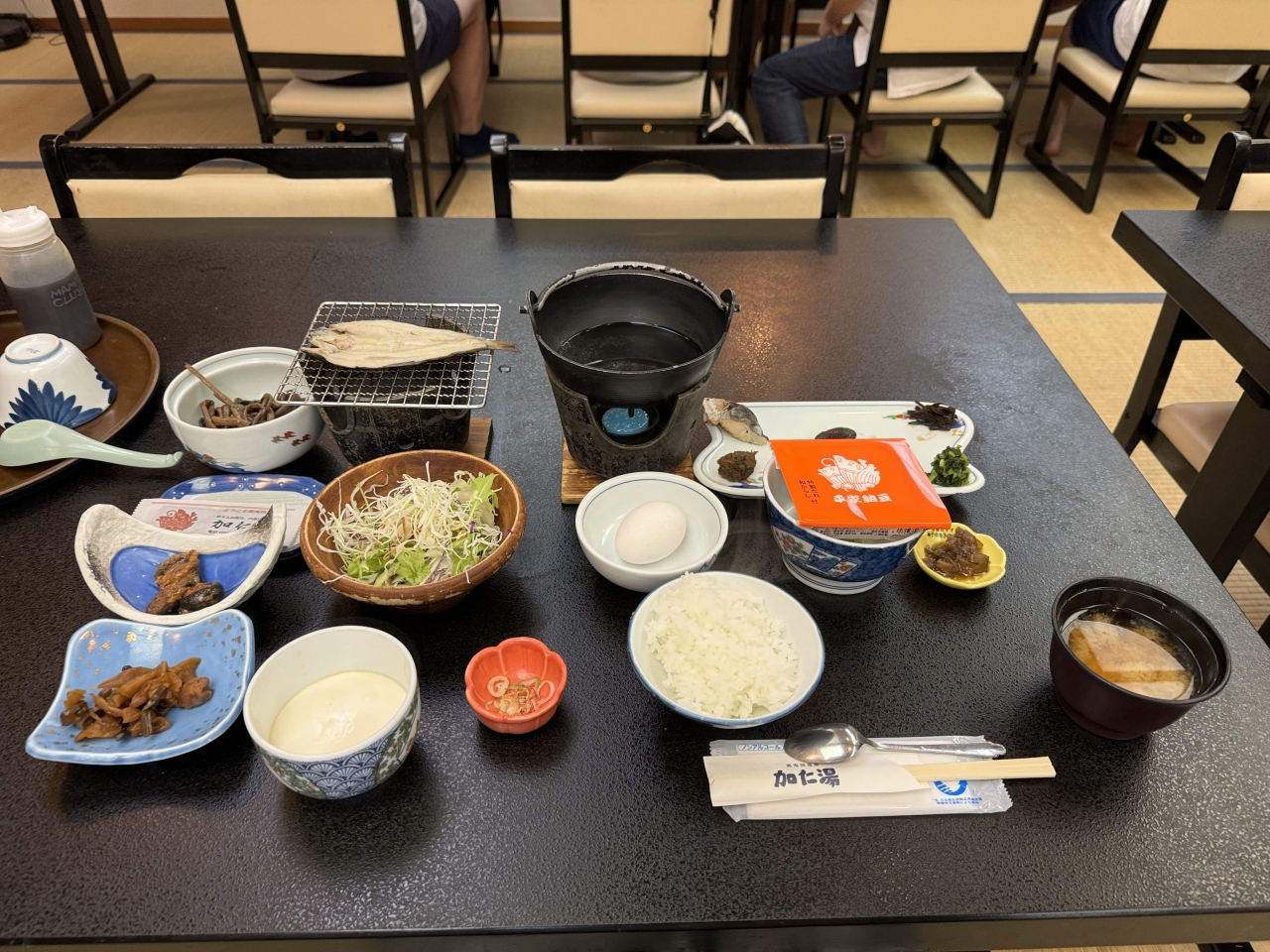 - 無料の朝食バイキングは最低限の内容ながら、鱒寿司や大きなおにぎりなどが用意されていて、思ってたより満足できました。