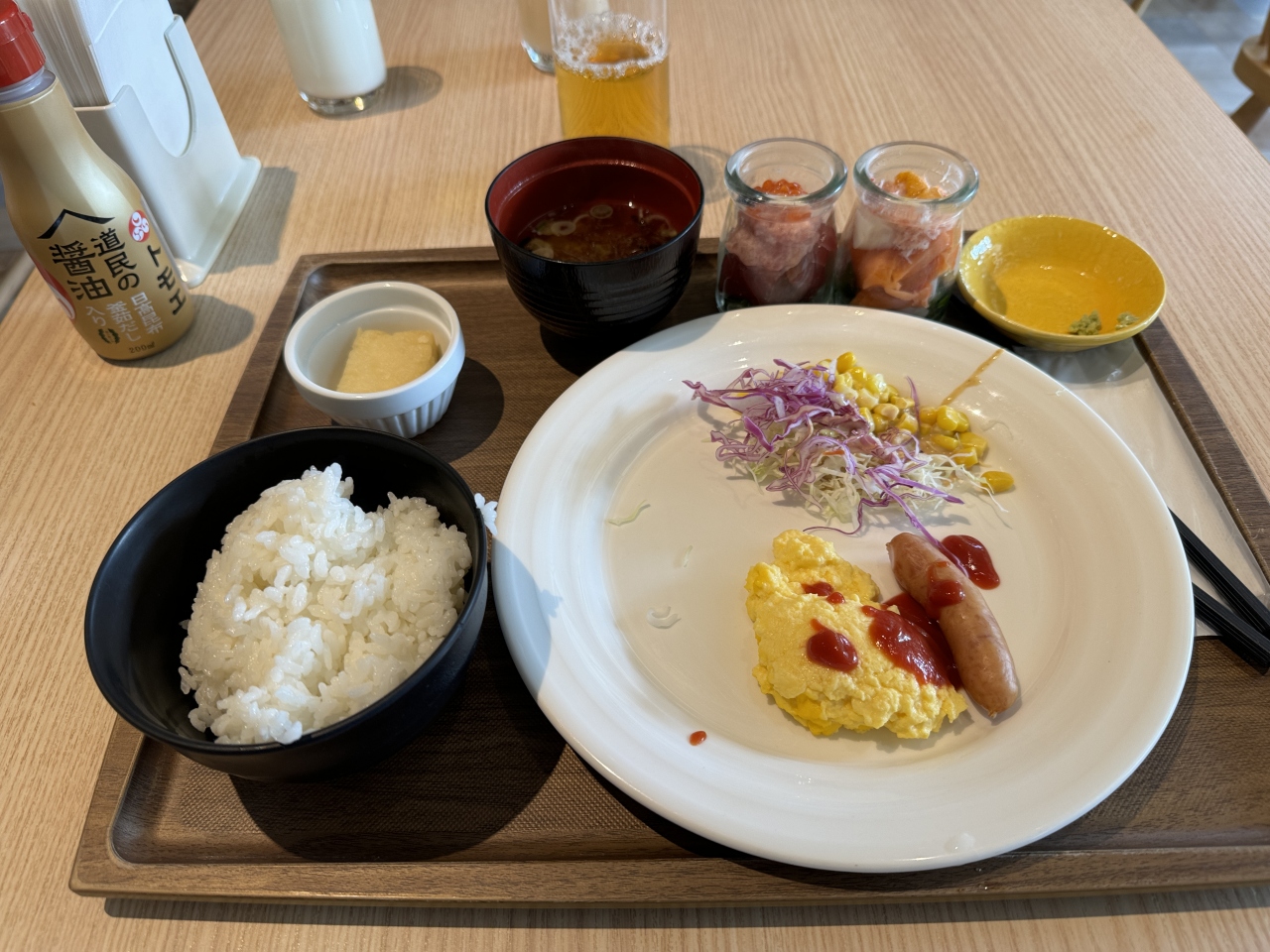 朝食はバイキングで目玉はやっぱり瓶詰めされた海鮮丼。こちらは瓶を席に持って行き、その中身を出してご飯にかけるスタイル。その他ご当地牛乳など函館らしい朝食メニューが充実しており、満足です。