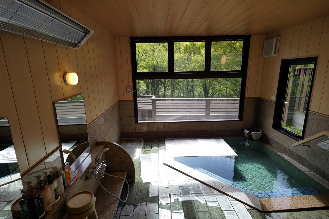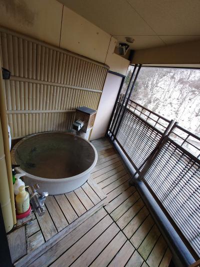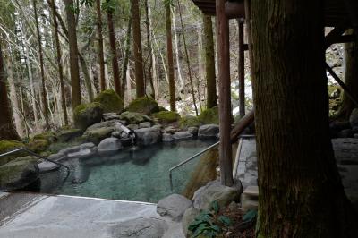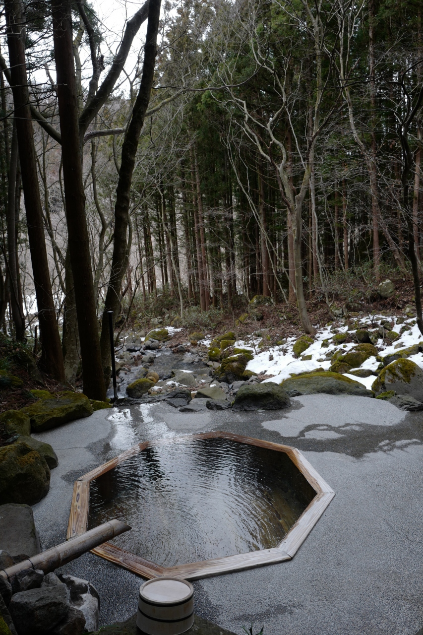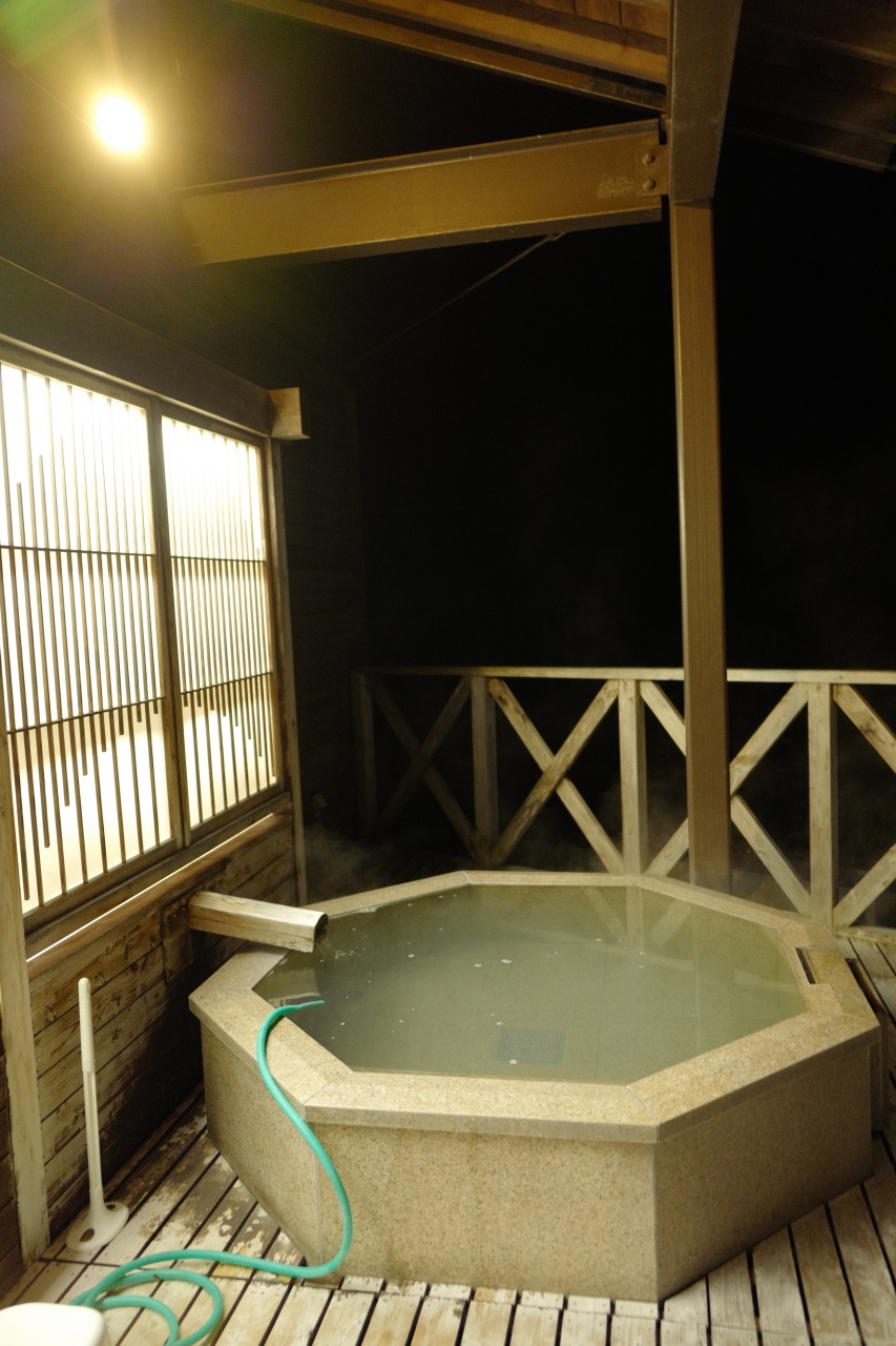 本館から屋外通路を少し歩いていくと脱衣所にぶつかるのですが、この離れ的な脱衣所ですら「綺麗なトイレ、エアコン完備で暖かい、湯上がりドリンクの入った冷蔵庫完備」という充実ぶりにびっくり。そして脱衣所から外に出ると、手前に大きい湯船、奥に小さな湯船の2箇所ある「野天風呂」に至ります。まるで登山道の途中で入浴しているようなロケーションを、私だけで独り占めできた時間は至福のひと時。滞在中1回しか入れないのが残念でならないほど、「深碧」が気に入りました。