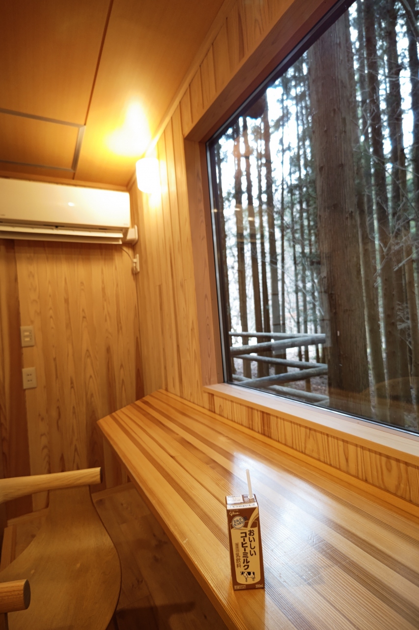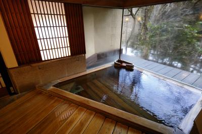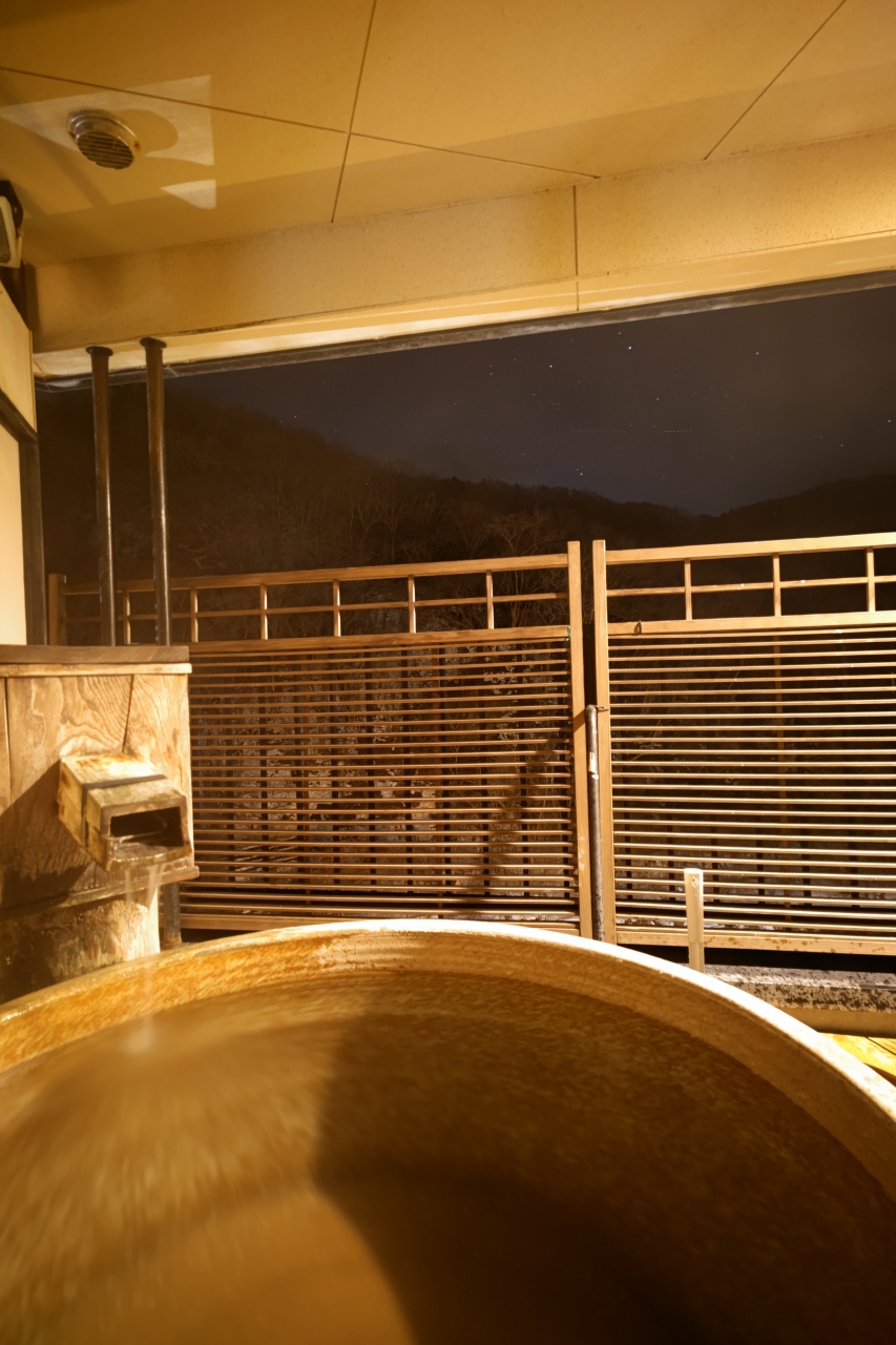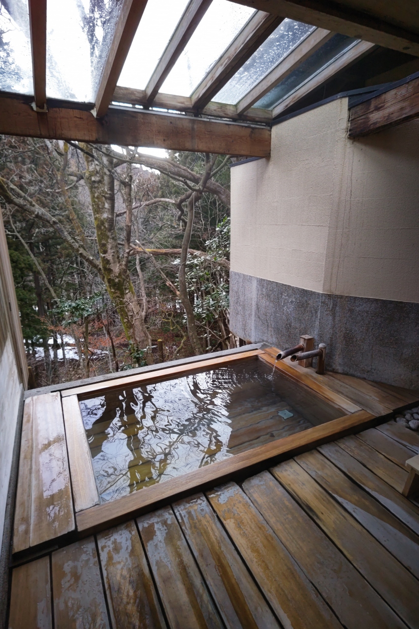 本館から屋外通路を少し歩いていくと脱衣所にぶつかるのですが、この離れ的な脱衣所ですら「綺麗なトイレ、エアコン完備で暖かい、湯上がりドリンクの入った冷蔵庫完備」という充実ぶりにびっくり。そして脱衣所から外に出ると、手前に大きい湯船、奥に小さな湯船の2箇所ある「野天風呂」に至ります。まるで登山道の途中で入浴しているようなロケーションを、私だけで独り占めできた時間は至福のひと時。滞在中1回しか入れないのが残念でならないほど、「深碧」が気に入りました。