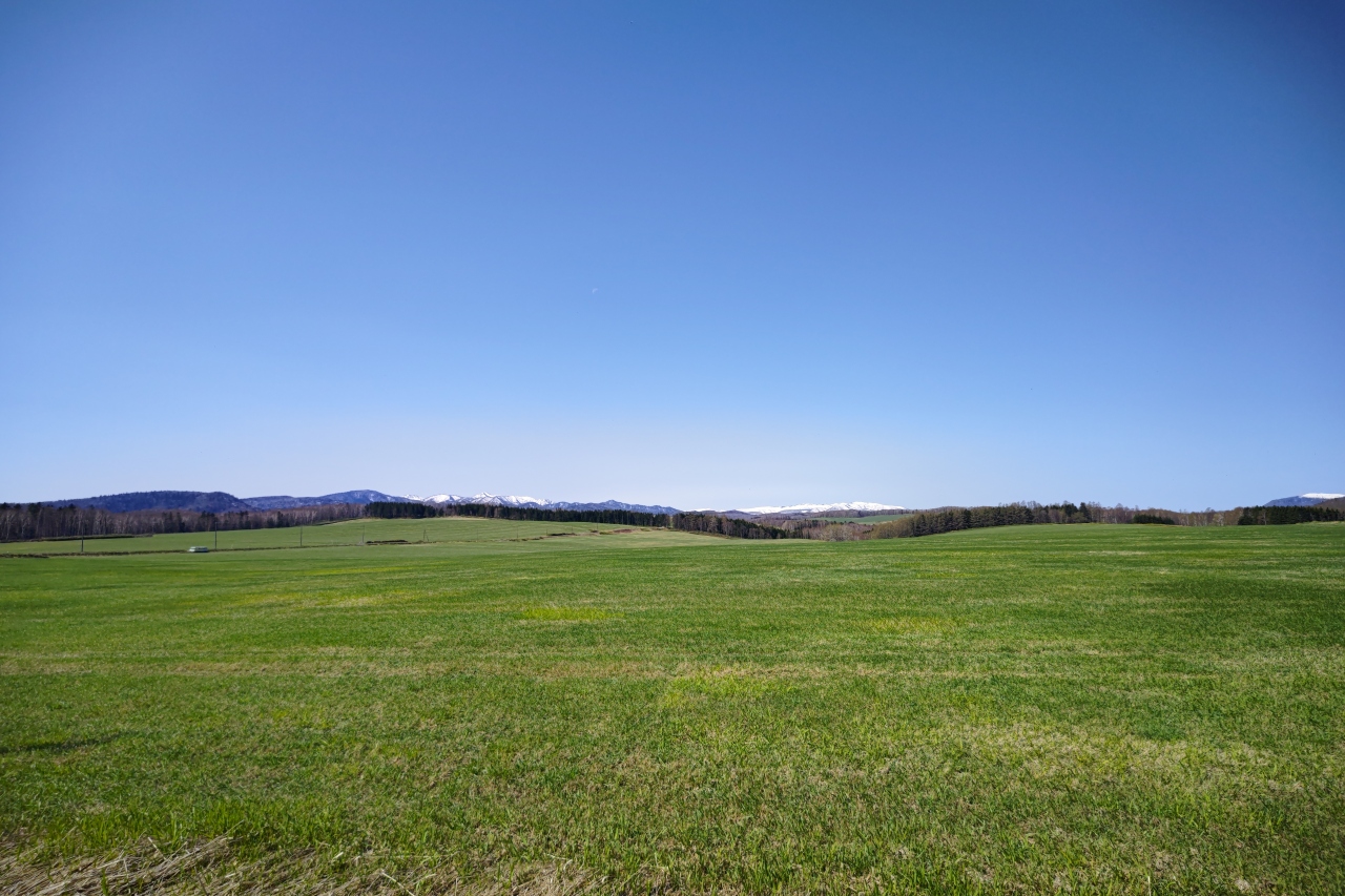 周囲は牛用の牧草を育てている農地のみなので誰もおらず、美しい空と遠くに望む雪山を一望でき最高の眺めが楽しめます。