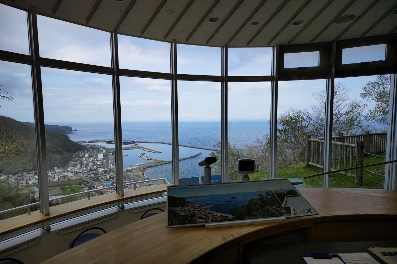 羅臼の街とオホーツク海を一望する高台にある展望台で、1階が展示室、2階が展望台(どちらも入場無料です)になっています。館内にはトイレもあり、トイレ休憩のついでに寄るのも◎。1階の展示室には羅臼や北方領土の歴史解説、羅臼が舞台の歌謡曲「知床旅情」がBGMで流れていたり。