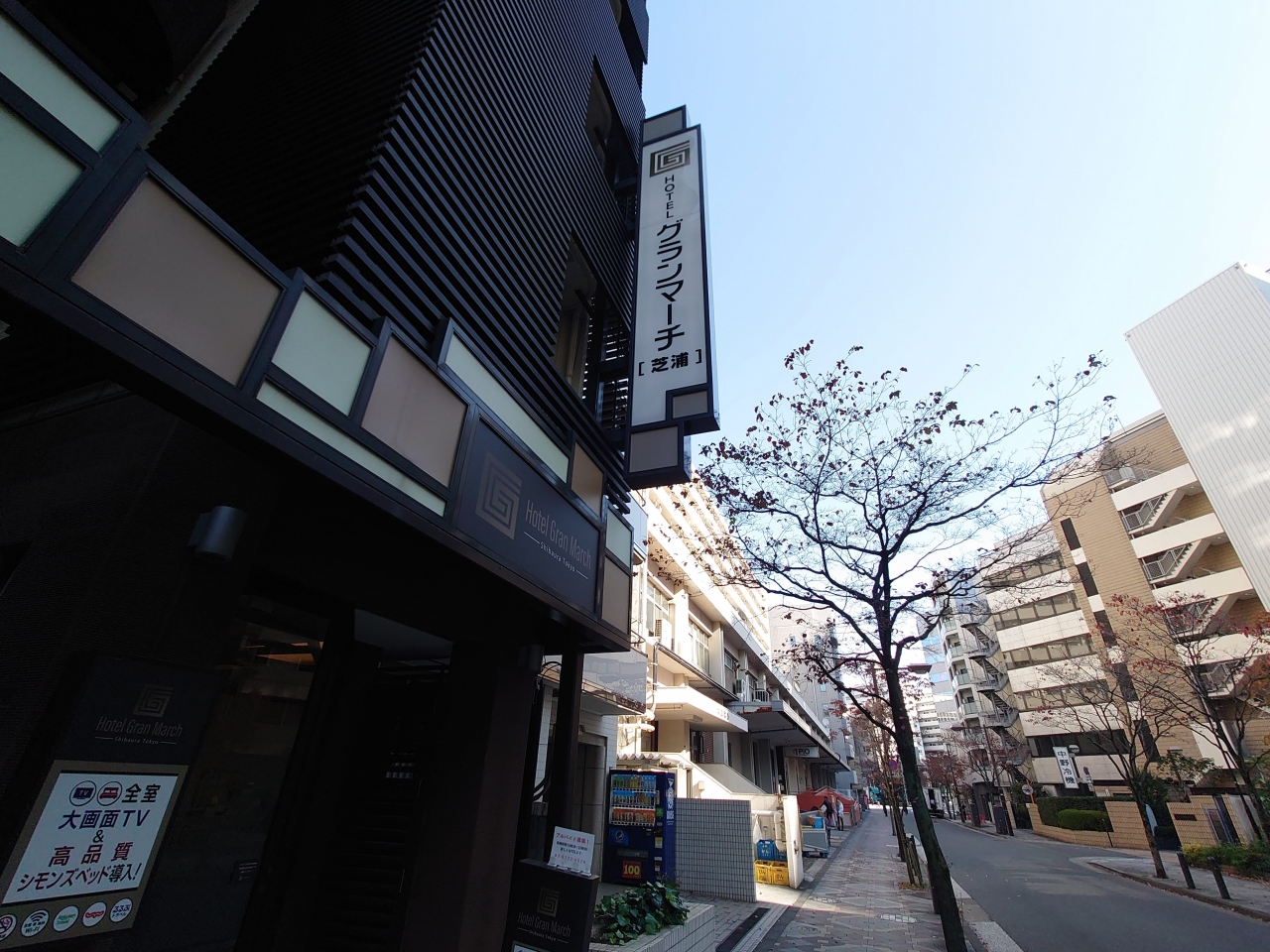 田町駅南口から少し南東に歩いた、駅の雑踏から離れた閑静なエリアに佇むホテルです。