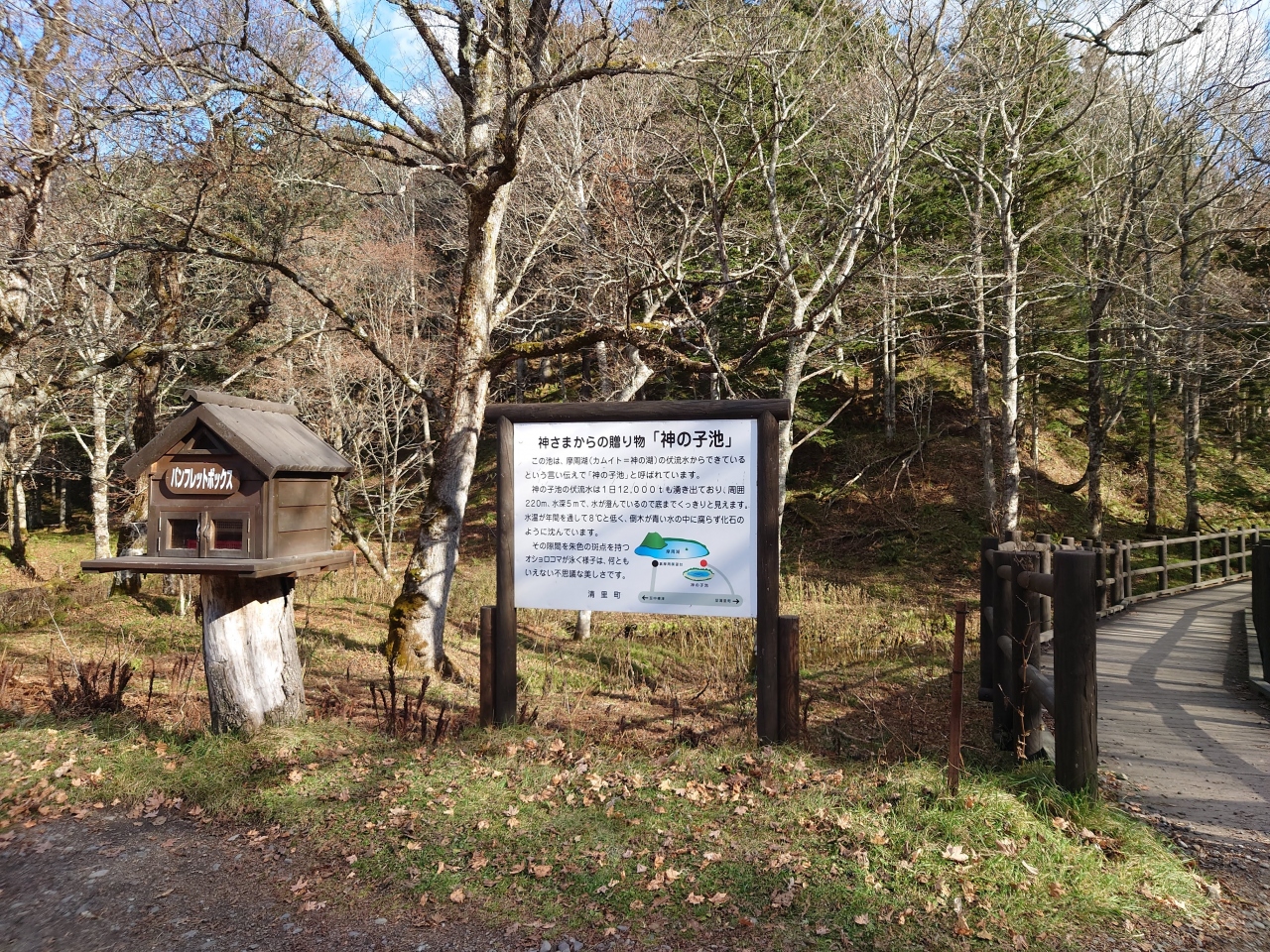 駐車場にはトイレがありますが、訪れた11月は冬季にあたるためか使用不可。肝心の池は駐車場のすぐ近くなので、簡単行けるのが良いもの。池周囲には歩道が整備されていて、ぐるっと一周回って神秘的な池の様子を観察できます。