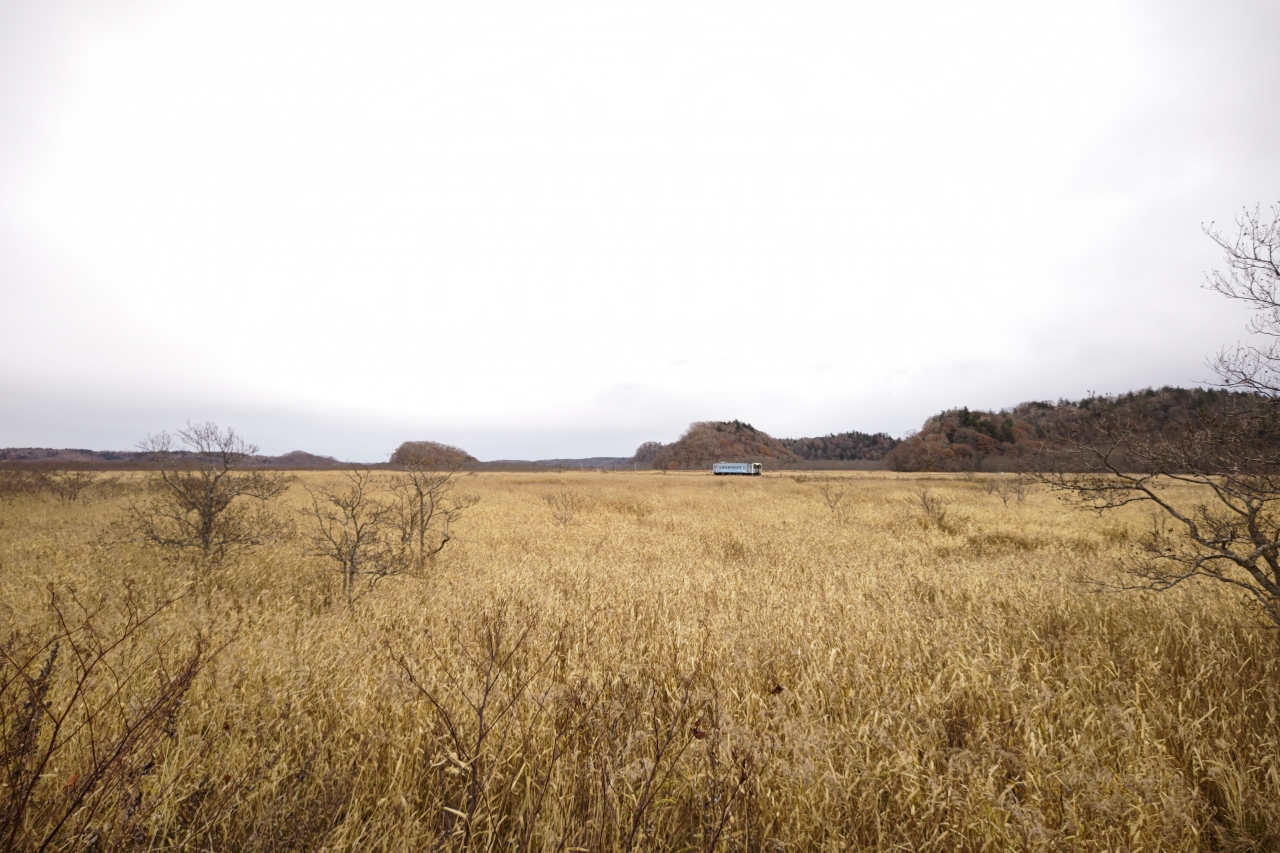 - 大湿原の中を駆け抜ける単行のディーゼルカー。とっても絵になる風景です。