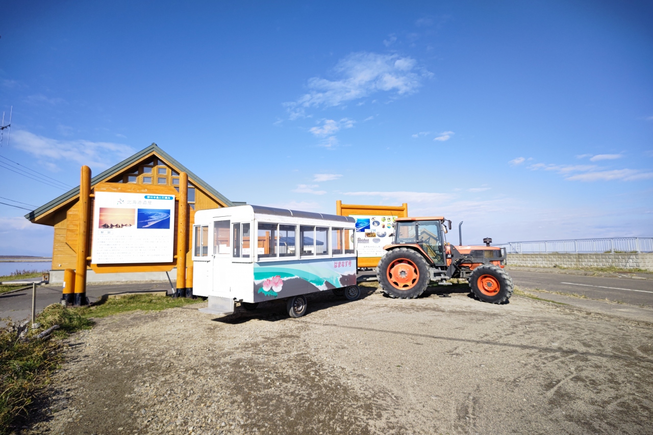 風蓮湖の北東側に飛び出たあたりの場所に駐車場があり、そこから徒歩又はトラクターバス「11月ごろ〜4月ごろまで運休」で移動すると風蓮湖のほとりに出ることができます。