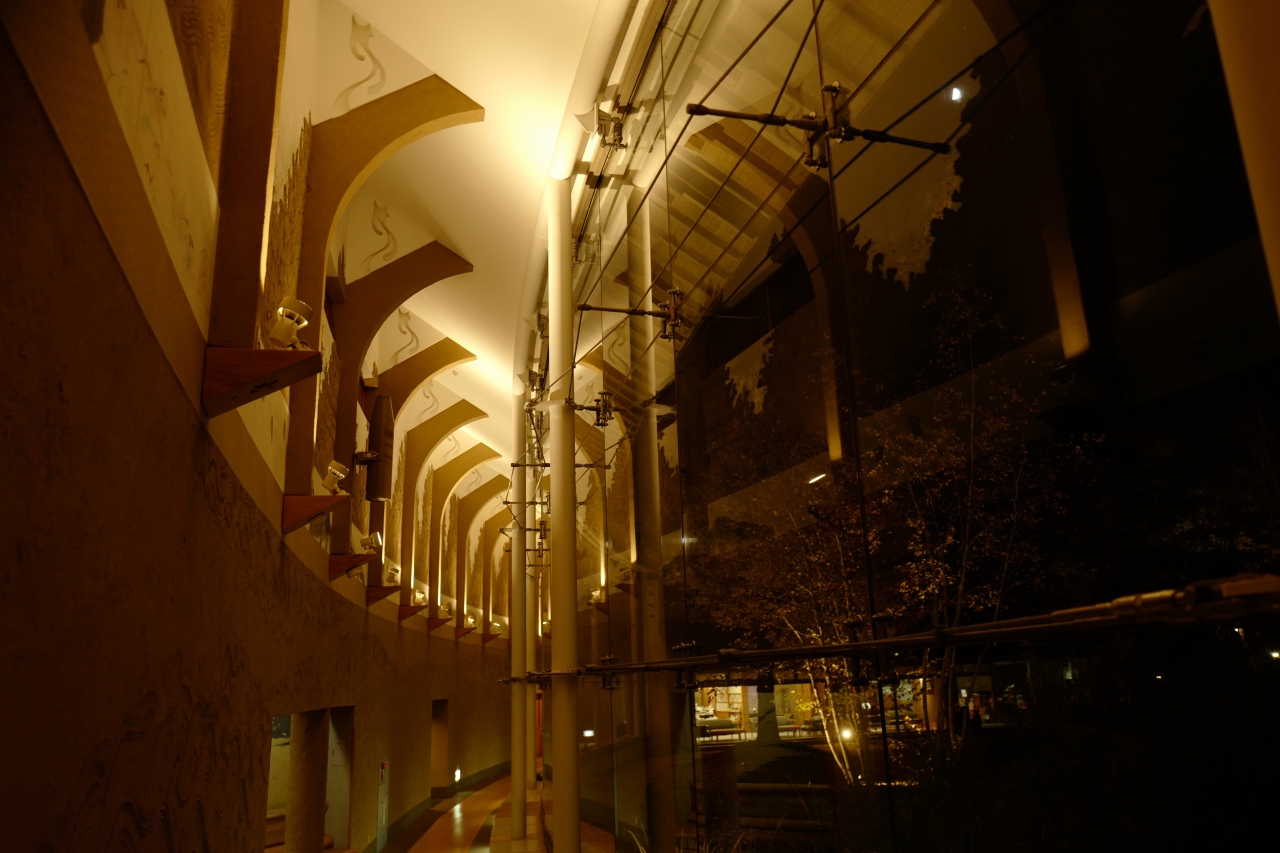 館内には広い庭やコーヒーが飲める読書室、独特な雰囲気の廊下など、まさに「大人の寛ぎ場」なる設備が揃っています。特に夜になると廊下の照明が輝き、外には月と星空が見えて最高でした。