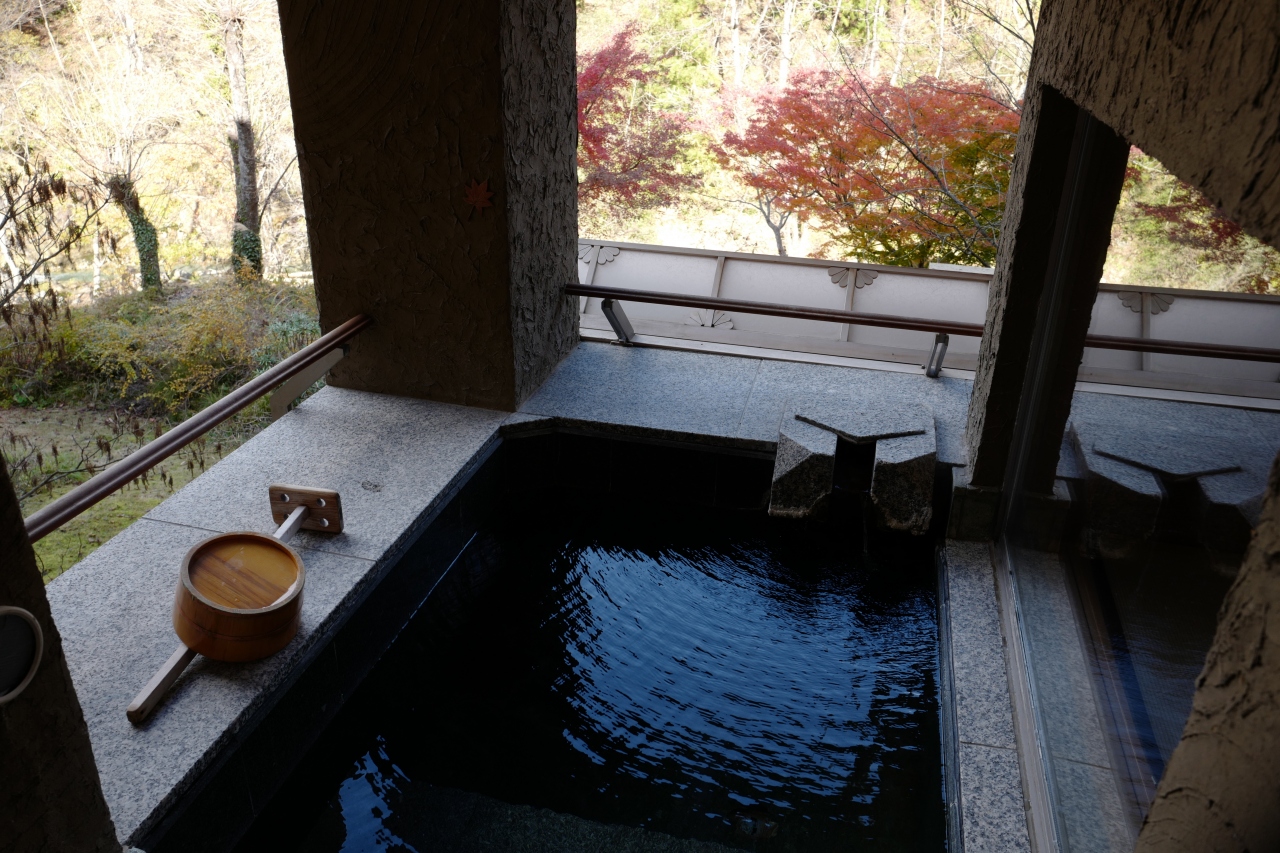 廊下から見て左側の浴場は「寝湯」のような感じで頭や足を置くスペースがあり、ゆっくり入れる一方大人数は厳しい雰囲気。翌日入った右側の浴場はそれと比べて開放的で、谷川の眺めが良く見えました。