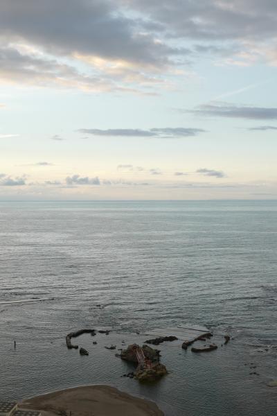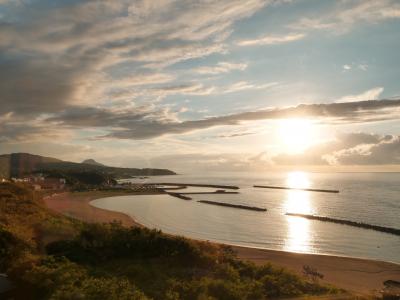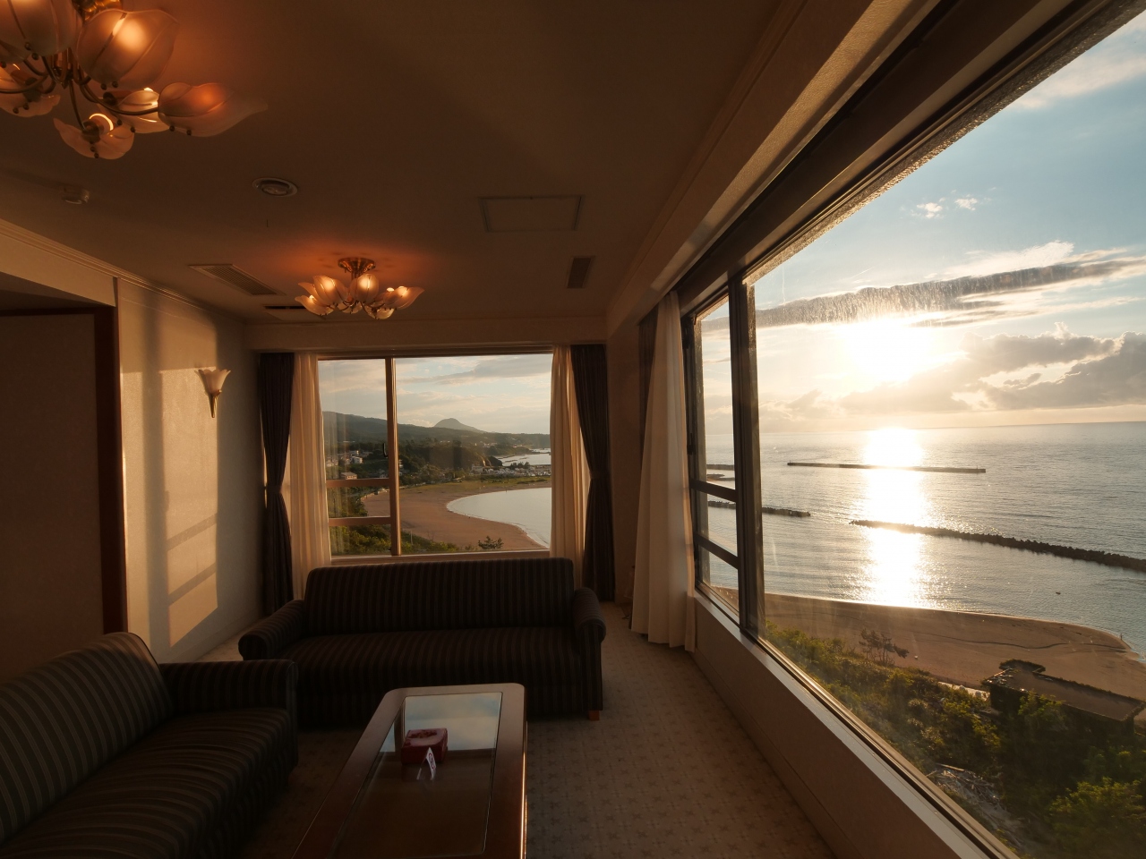 番神岬を見下ろす高台にあるリゾートホテル。岬の近くから階段で1階の玄関へ向かい、そこからエレベーターで更に上がった5階がフロントになっています。(車でエレベーターのある1階にも行けます。)チェックイン時のフロント対応も良く、更に別のエレベーターに乗り換え10階の特別室へ。特別室はゆとりのあるリビングと和室、ベッドルームがあって5人くらいで泊まっても余裕があるほどの広さ。日本海を見下ろすオーシャンビューも文句無しで、日本海に沈む夕陽も見ることが出来ました。