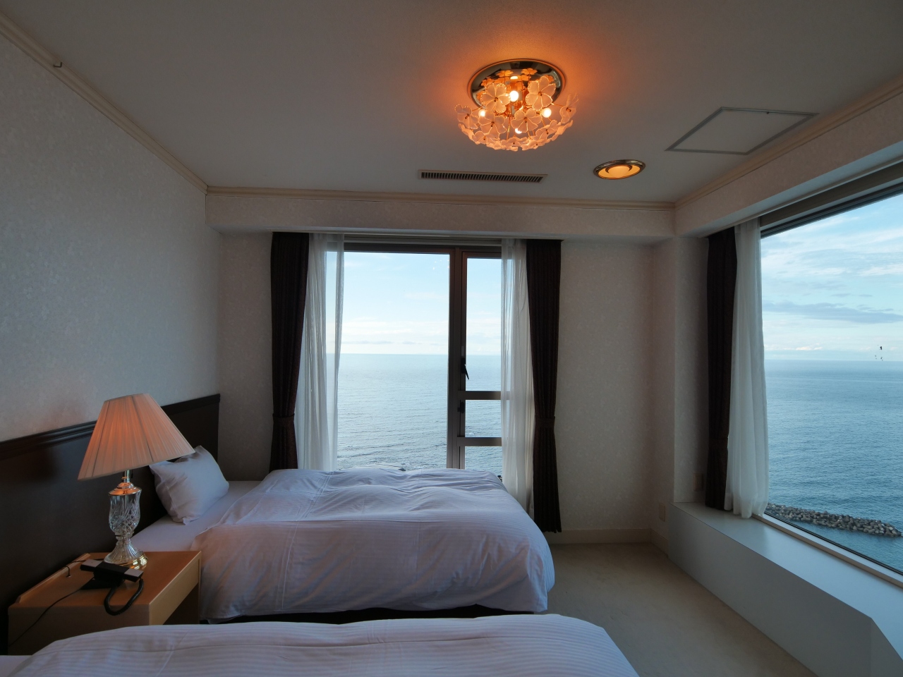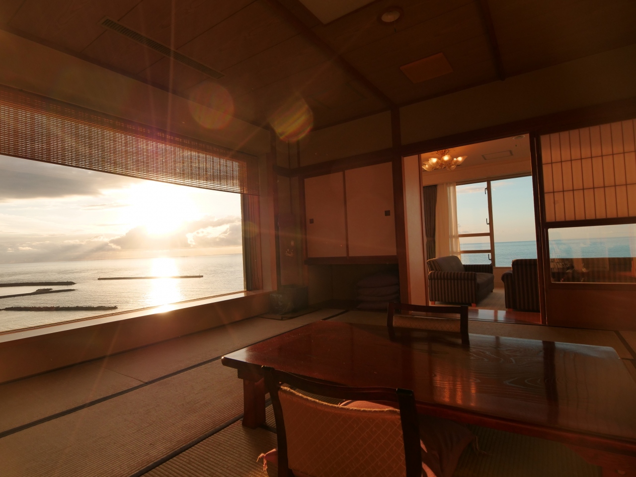 岬と日本海を見下ろす、最高の立地にあるリゾートホテル。ゆとりある広さと抜群の眺望を誇る特別室も最高。
