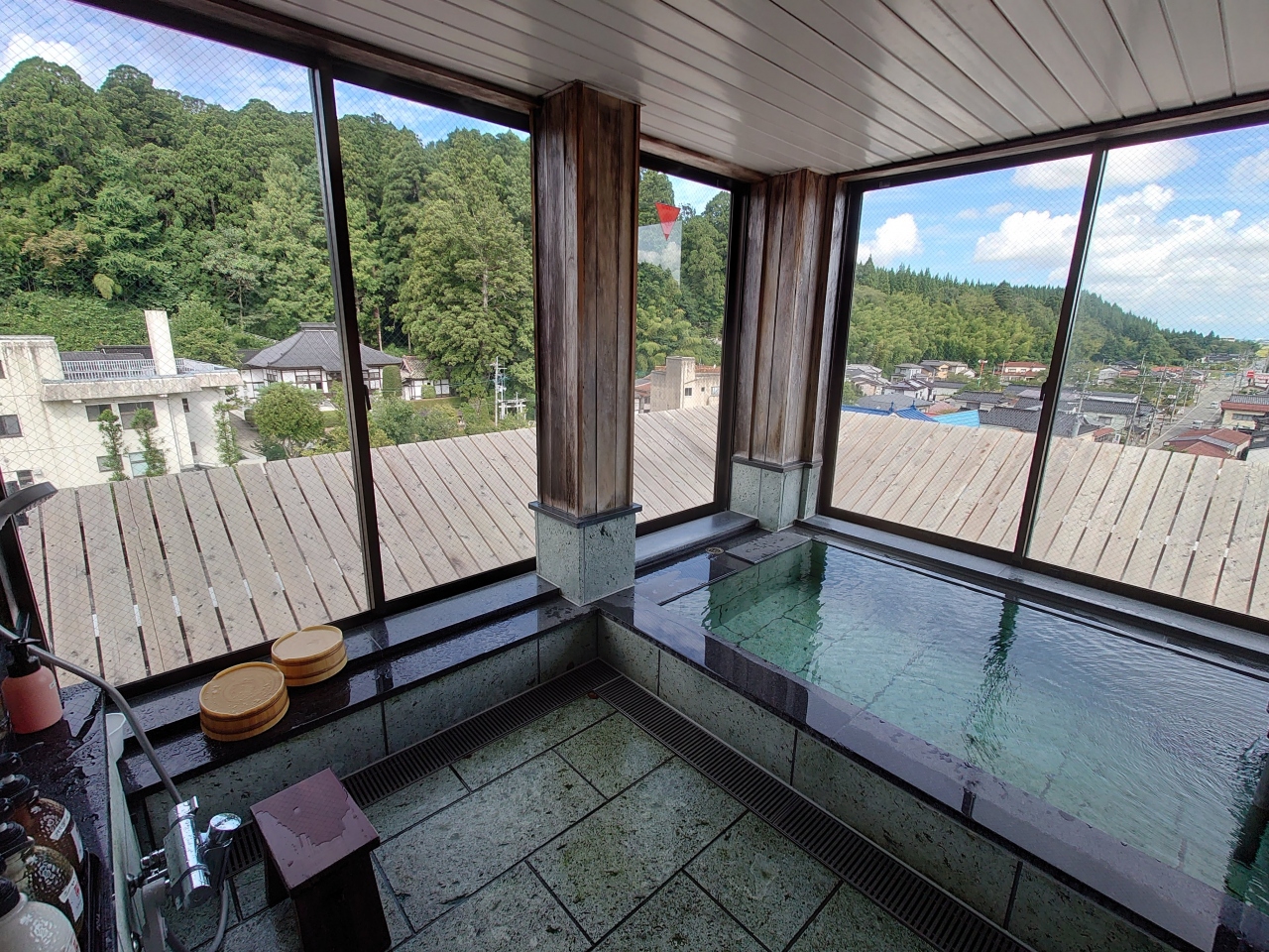 温泉は部屋以外に、3階の大浴場がありましたが、この日は雨で寒かった為露天風呂はぬるくてまともに入れず。でも雰囲気は良かったので、天気が良くて見晴らしが効けば印象が変わりそうです。