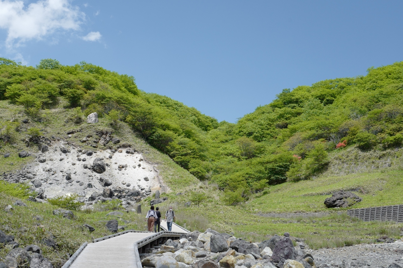 湿原へは駐車場奥から山道や階段を歩くこと15分余りで到達。所々足元がやや悪いので、しっかりとした靴で行きましょう。湿原からは那須の山々や新緑、ツツジの花など大自然の景色を存分に楽しめ、アップダウンもないのでとっても歩きやすいです。
