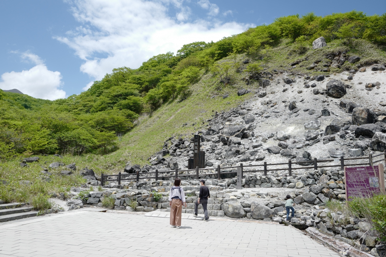 常に火山ガスが漂っており、ここに来た動物が次々と死んだことから「殺生」の名がついたとのこと。道路脇の駐車場はあまり台数が多くないので、停めるのはなかなか厳しいかも。トイレ完備の駐車場から先は歩いて見物できるようになっていて、石の周辺は硫黄臭が漂い植物は殆ど生えていません。それなのにお花のような彩があると思えば、カラフルな着付けをされたお地蔵さんがずらり。殺生石本体にも印がされていて、不思議なパワーを頂けそうな感じでした。尚殺生石前から温泉神社に抜ける道があり、更に温泉神社から駐車場に降りる階段もあるので、車が置けたら神社と合わせて巡るのもオススメです。