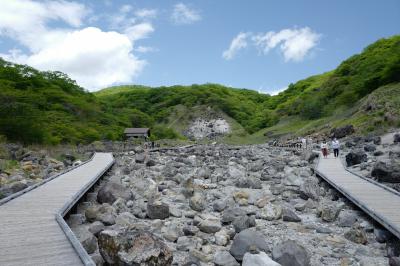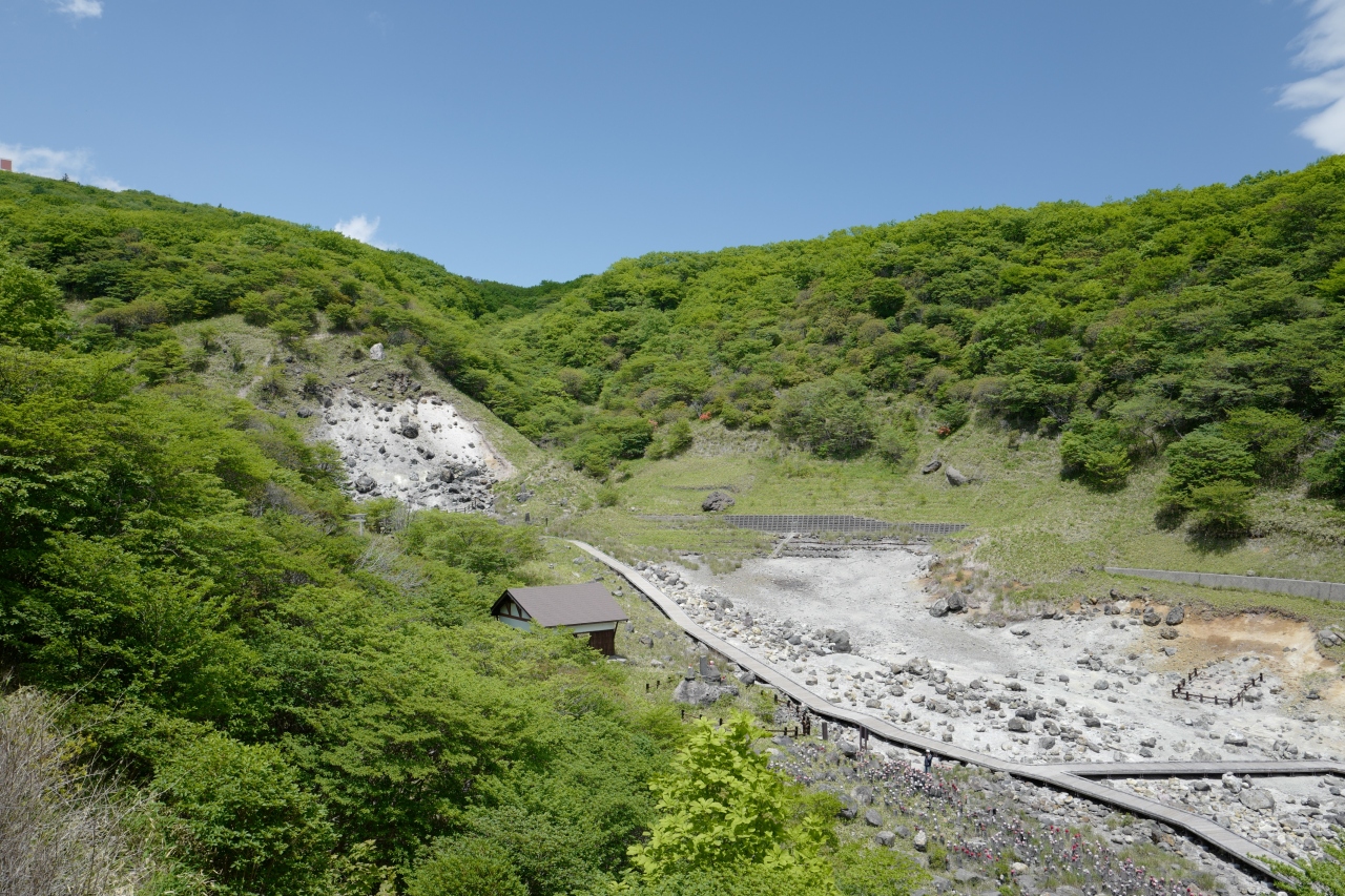 ロープウェイ乗り場へ続く山道の手前にある、硫黄臭漂うデンジャラスな場所。
