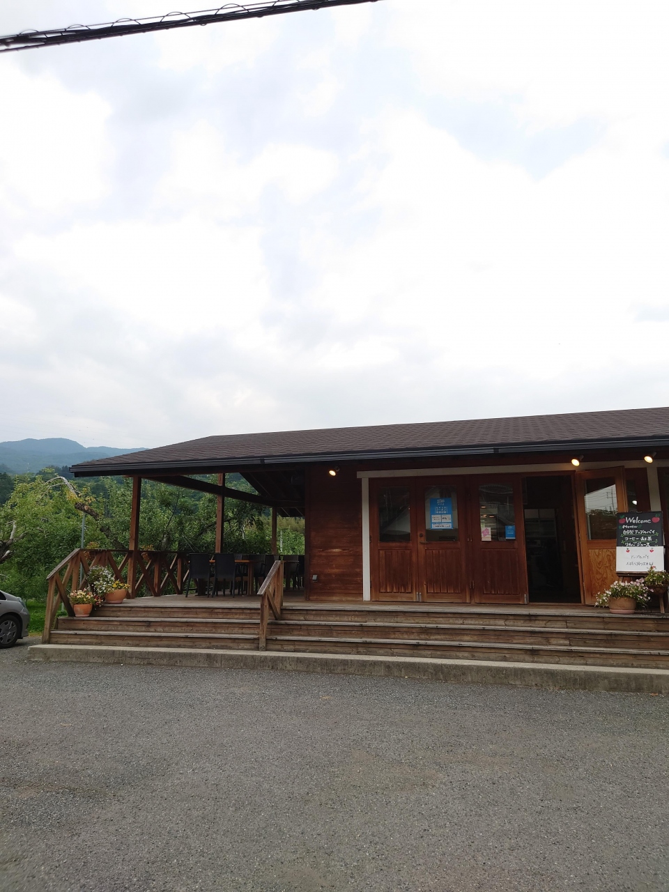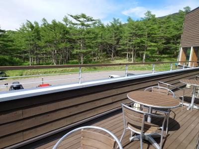 - 店内席に加えて、上牧の風を感じられるテラス席もあり。ログ調の建物に雰囲気も良い。