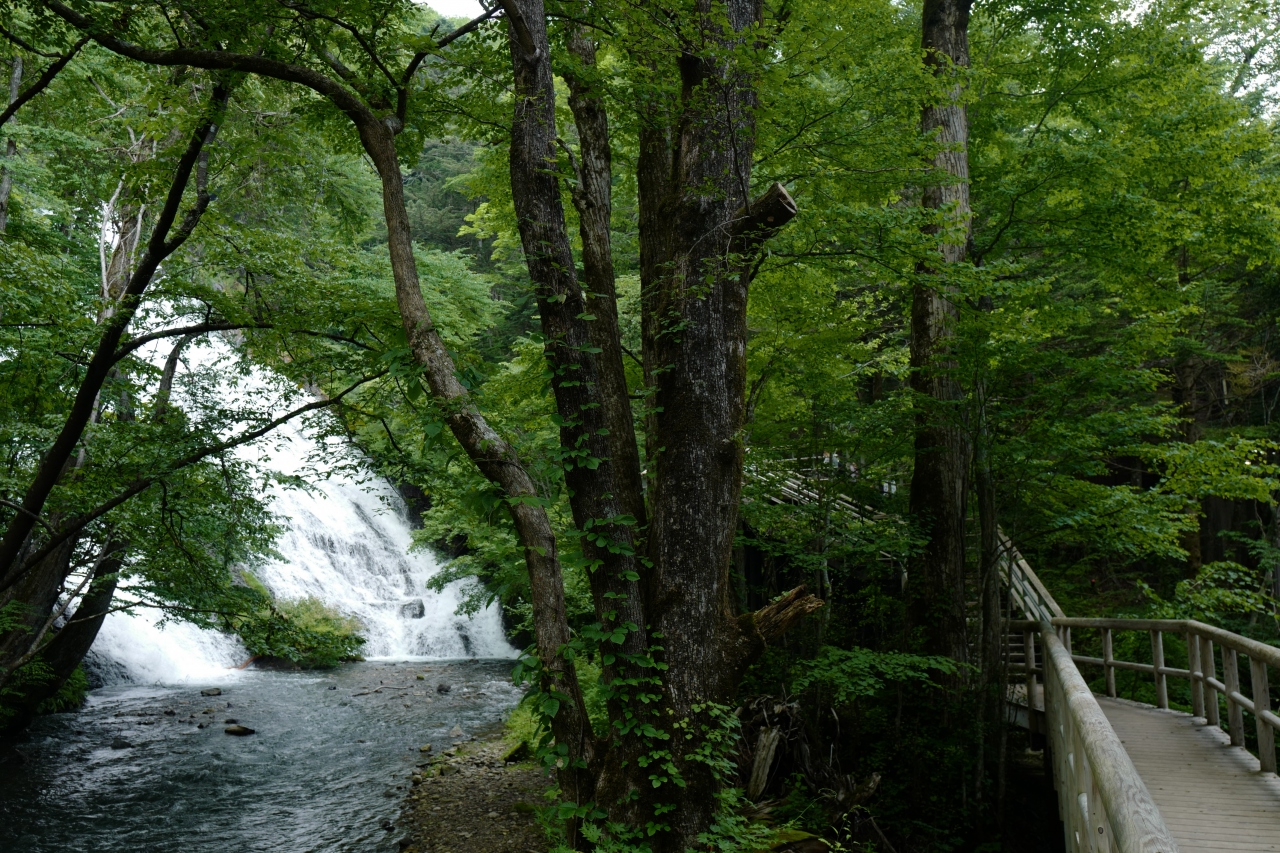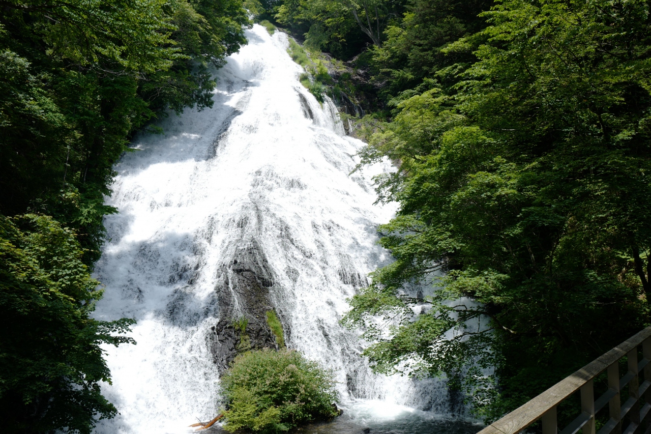 戦場ヶ原の奥にある、豪快に流れ落ちる滝。バリアフリー対応なのも注目すべきポイントでしょう。