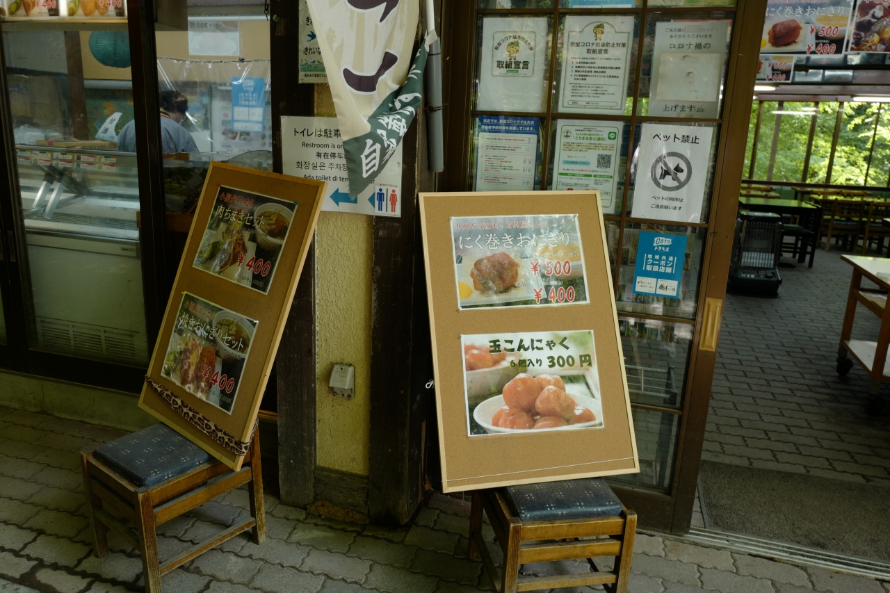 食事系メニューは焼きおに、ちまき、肉巻きおにぎり&味噌汁そして、名物の鮎の塩焼きと団子のみ。かつてはそば類の提供もあったようですが、恐らく今はロスが出にくい冷凍食品をメインにしているのでしょう。(ちなみに併設のコンビニに弁当は置いてありませんでした。訪問日が平日だったからかもしれませんが。)
