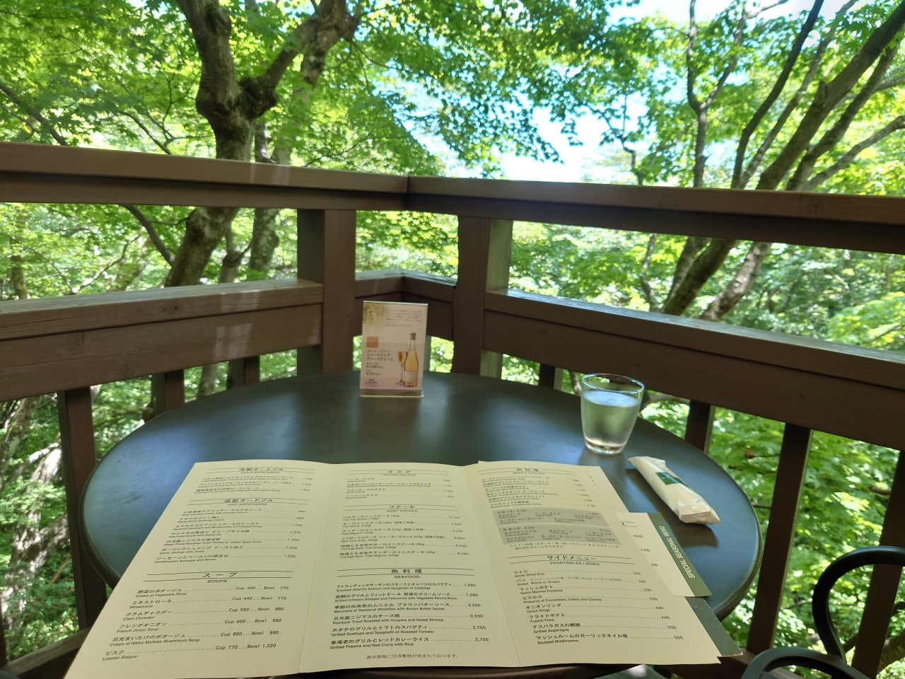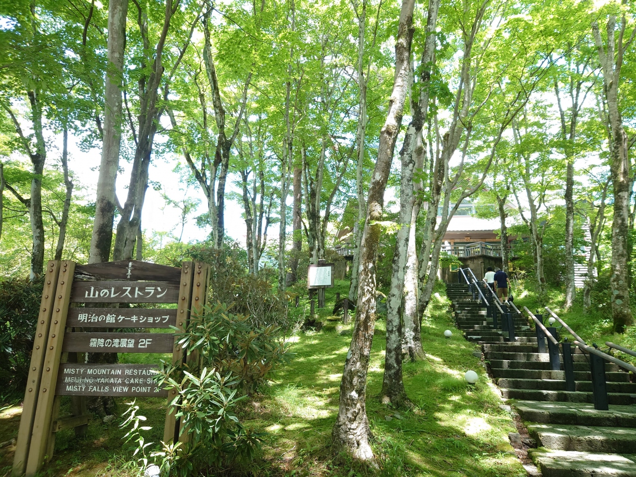 霧降の滝入口という抜群のロケーションにあるレストランで、人気の為に混雑することも多いようです。今回は11時半ごろに入ったものの、既に50分待ちと言われ、2階の待合所で待つこと30分後、テラス席に通されました。