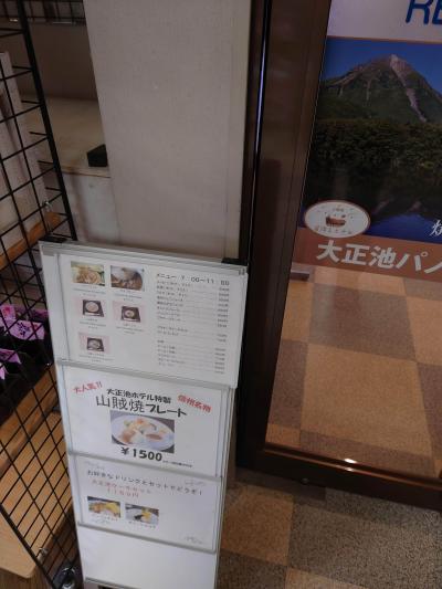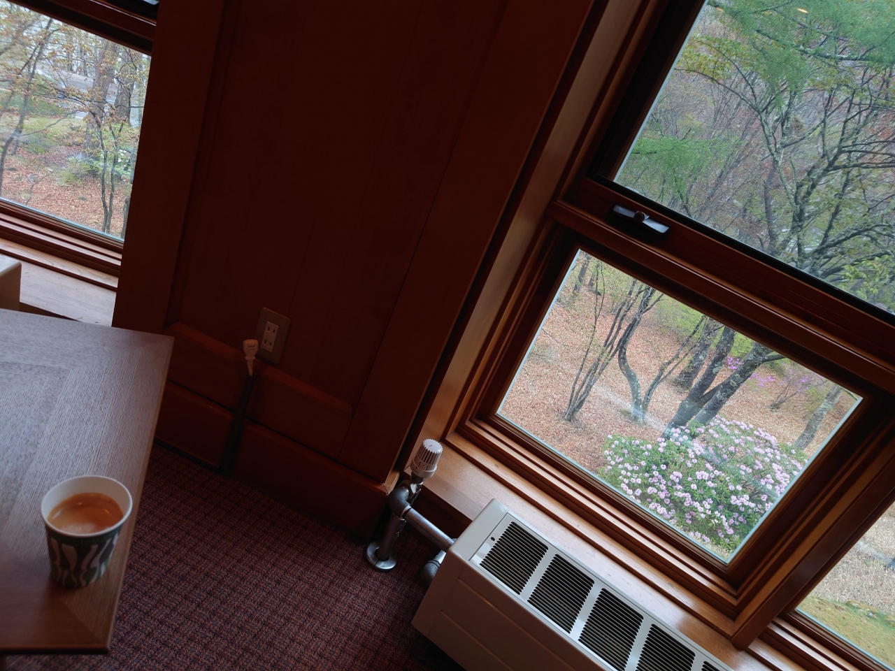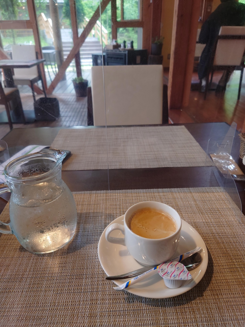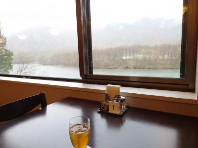 大正池のバス停に降り立った途端、雨が強くなってきてしまいました。バス停の真ん前にある、大正池ホテルさんのレストランが朝7時から営業していて、宿泊者以外でも気軽に入れる感じだったのでここで雨宿りしていくことに。