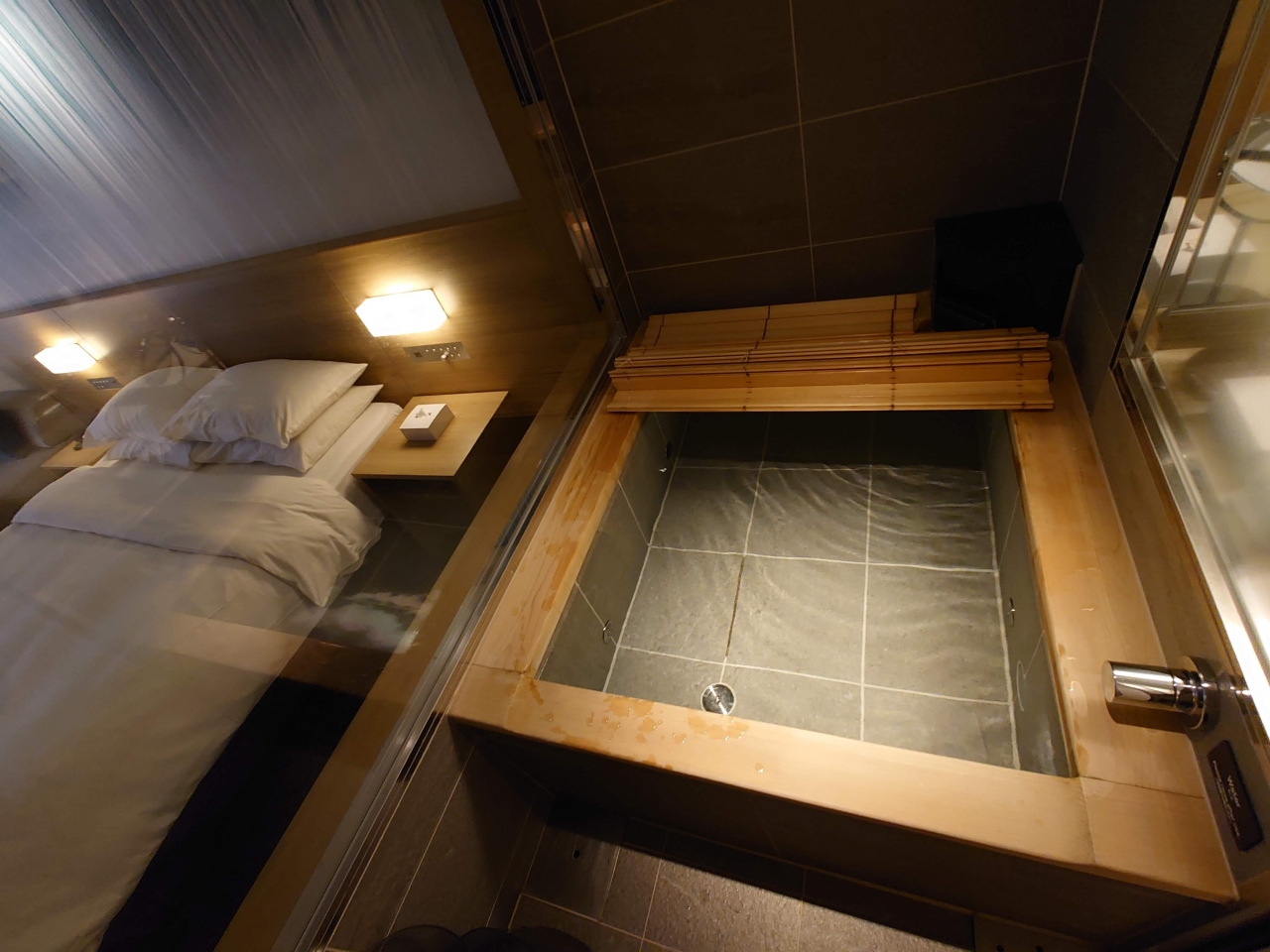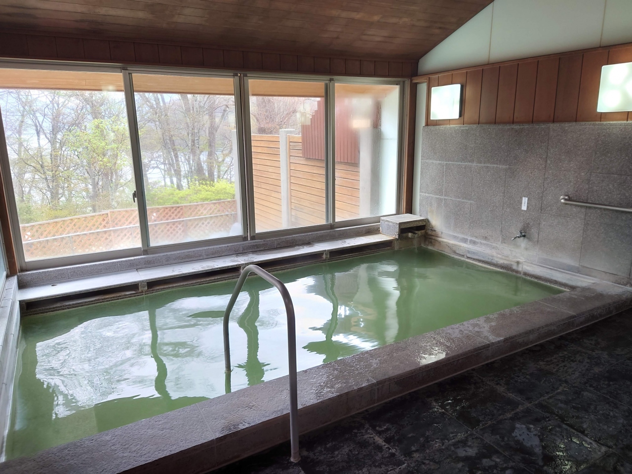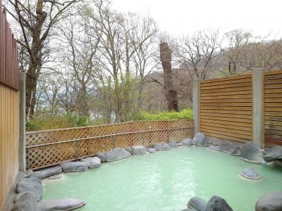 温泉は部屋・大浴場共に同じ循環のお湯で泉質はそれなり。部屋温泉はベッドの手前に綺麗な小さなものがあり、いつでも気ままに入れるのが良い。2階と1階にある大浴場(それぞれ男女入れ替え制)にも入りに行きましたが、そちらも空いていて快適に満喫。特に朝風呂で入った露天風呂では、新緑の下で美味しい空気を吸いながら温泉を楽しめなかなか。