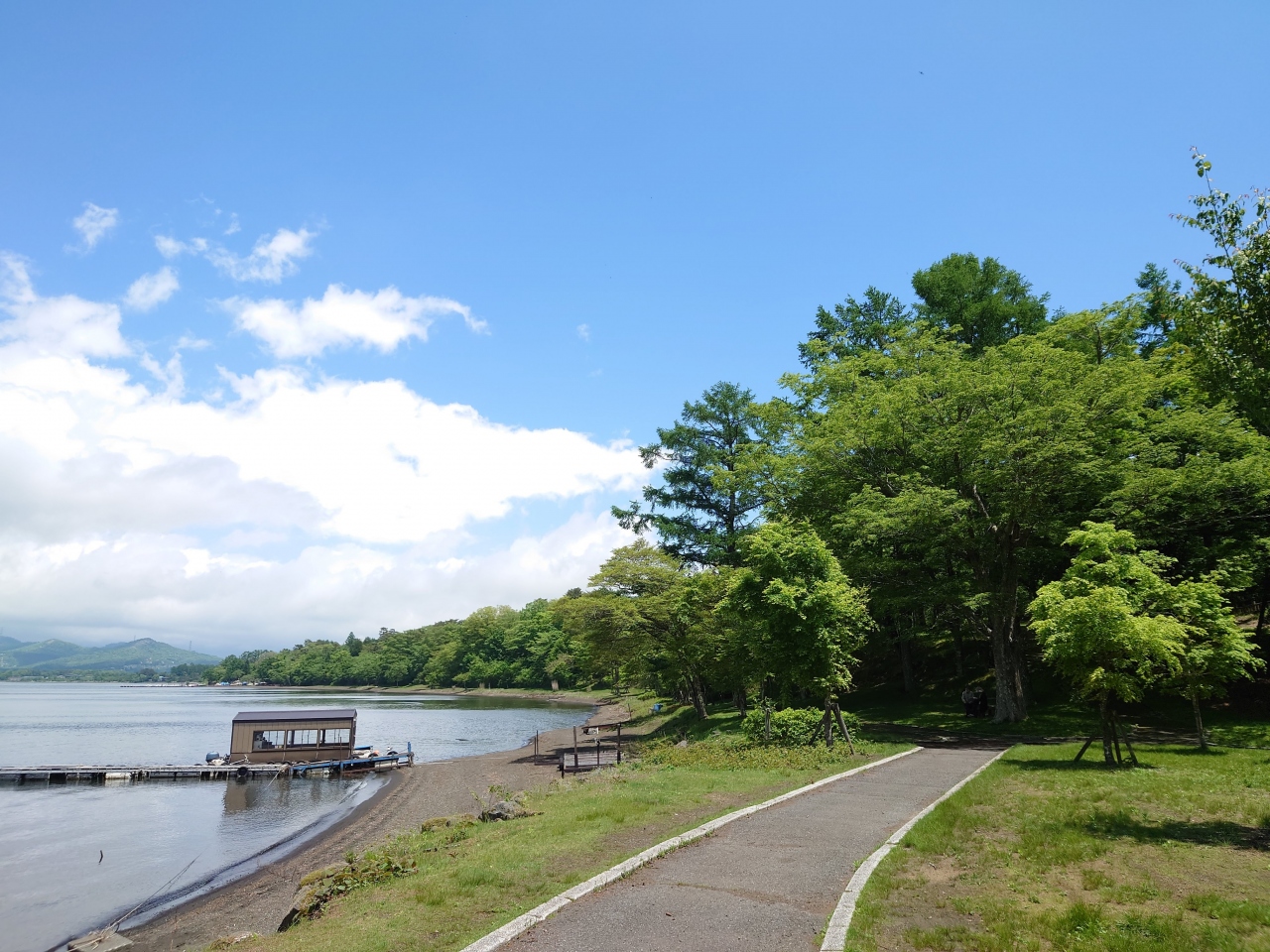 山中湖南側の拠点、旭日丘バスターミナルの湖側にある公園です。公園の少し西側にはセブンイレブンがあり、駐車場・トイレ・ベンチ・東屋も至る所にあるのでピクニックを楽しむのに絶好の場所です。散策道も湖畔沿いの山中湖のレイクビューが良く楽しめる道から、少し高い場所を通る新緑の中を行く道もあり、往復でルートを変えて楽しむのも良い。