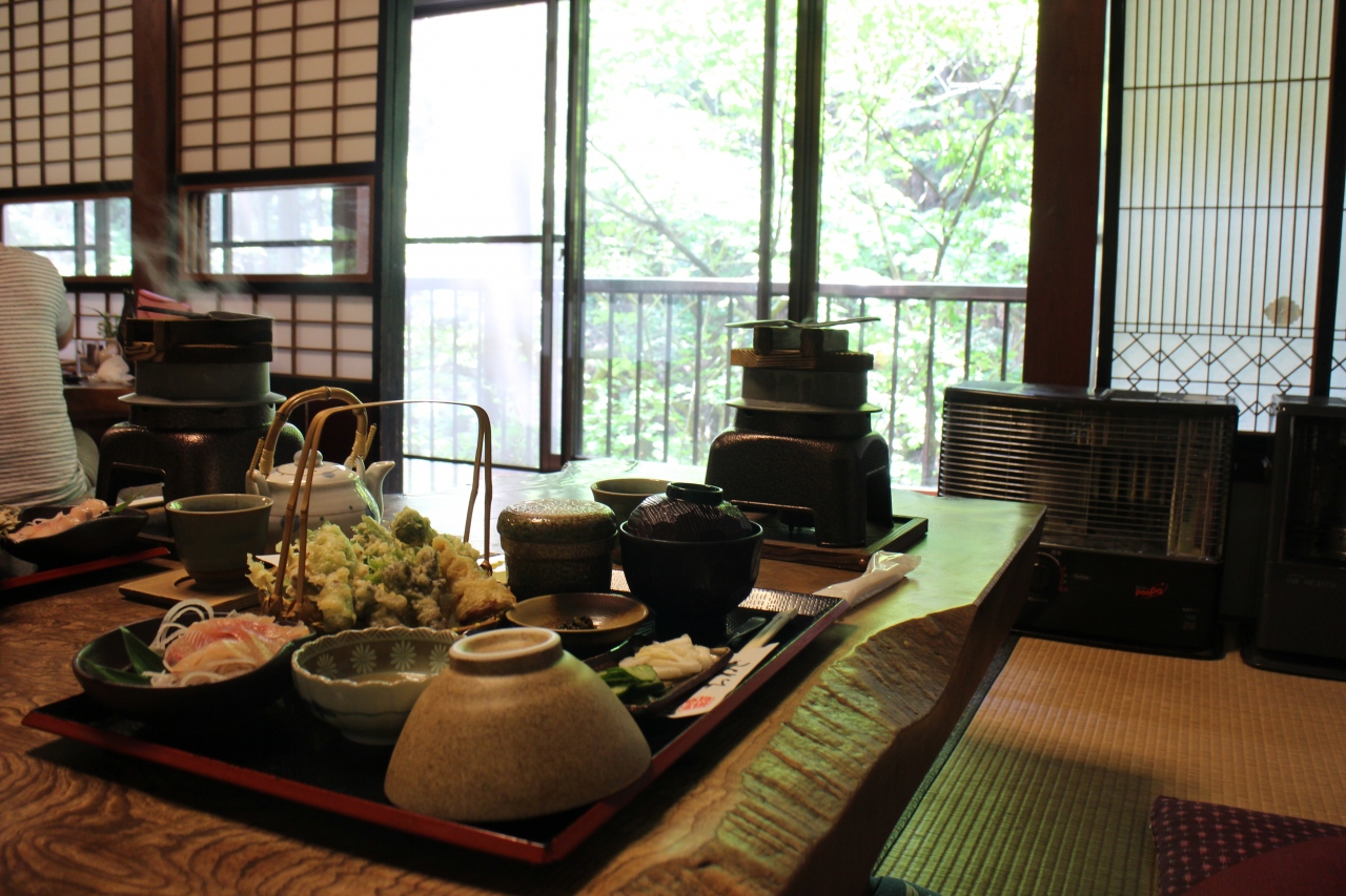 座敷からは新緑と川のせせらぎを味わいつつ、山菜や川魚といった山の幸を使った料理を堪能。店員さんの感じも良く、とても居心地が良かったです。