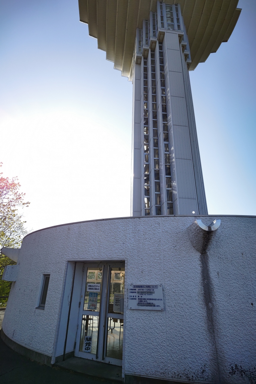 遠くからも目立つ、派手なデザインが印象的な展望塔。100段以上の狭い階段のみ&眺望もガラス越しです。