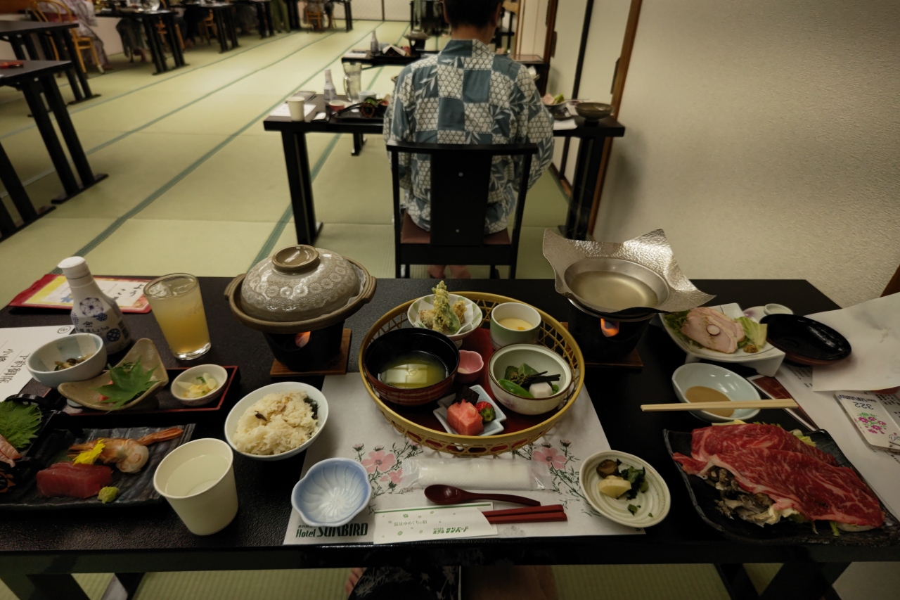 食事は1階のレストランで朝夕共に頂きます。夕食は主菜が肉魚で、主食の釜飯の種類がそれぞれ選べるチョイスメニューになっていました。個人的には魚料理が多い印象だったので、主菜は肉串を選ぶのがオススメ。品数豊富な料理に加えて、夕食中に現れたフクロウの姿にも満足でした。